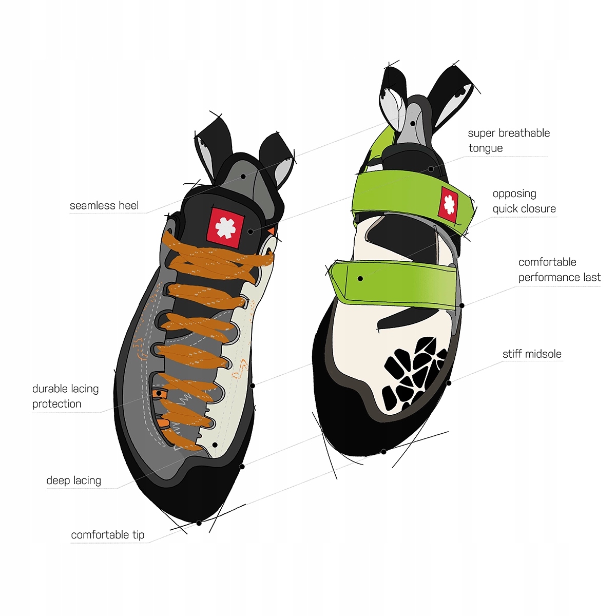 Слегка асимметричная обувь, предназначенная для спортивного скалолазания, но также идеально подходящая для маршрутов с несколькими веревками.
