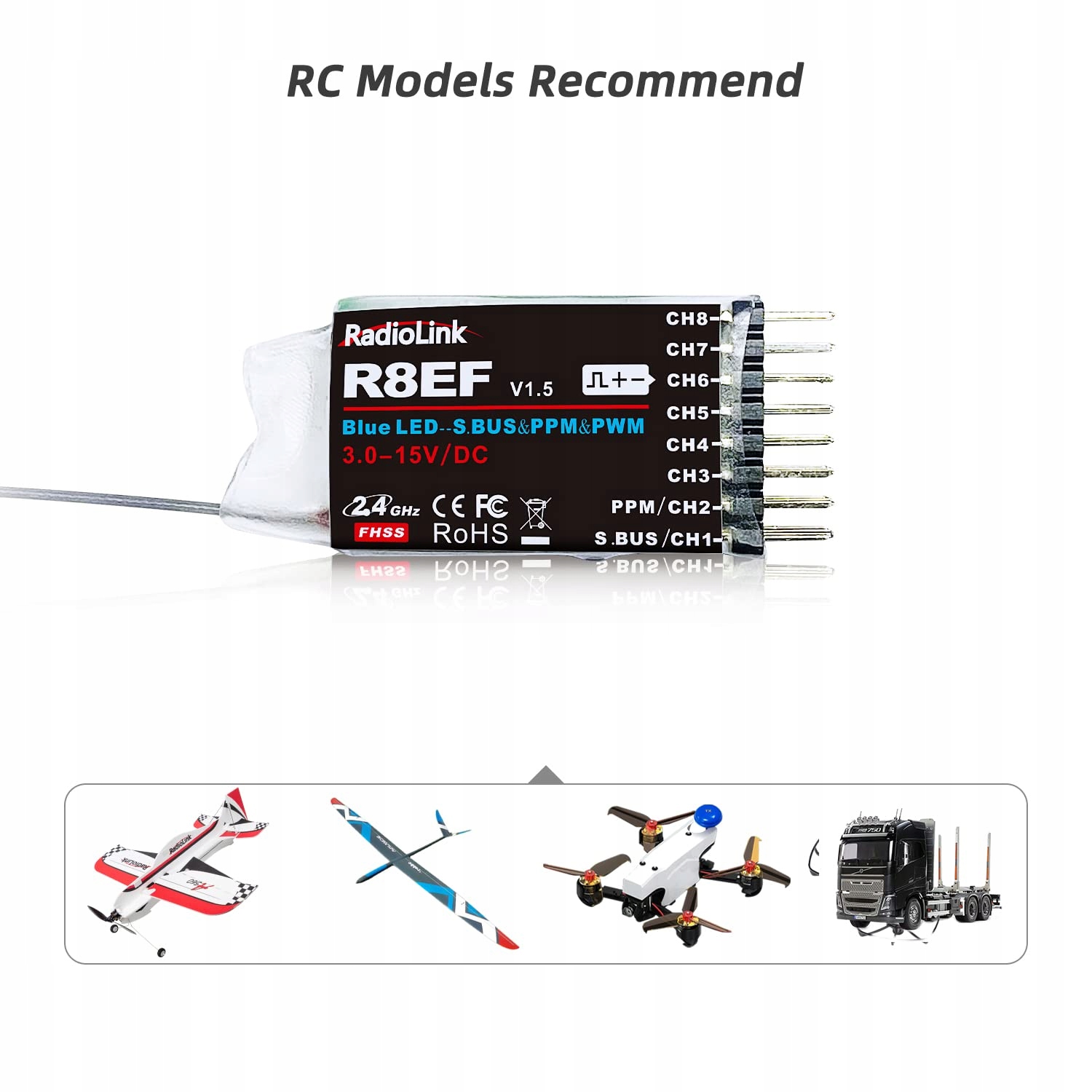 R8EF может хорошо работать с интерактивными моделями на рынке, такими как самолет, планер, мультикоптер, радиоуправляемая машина, лодка и роботы.