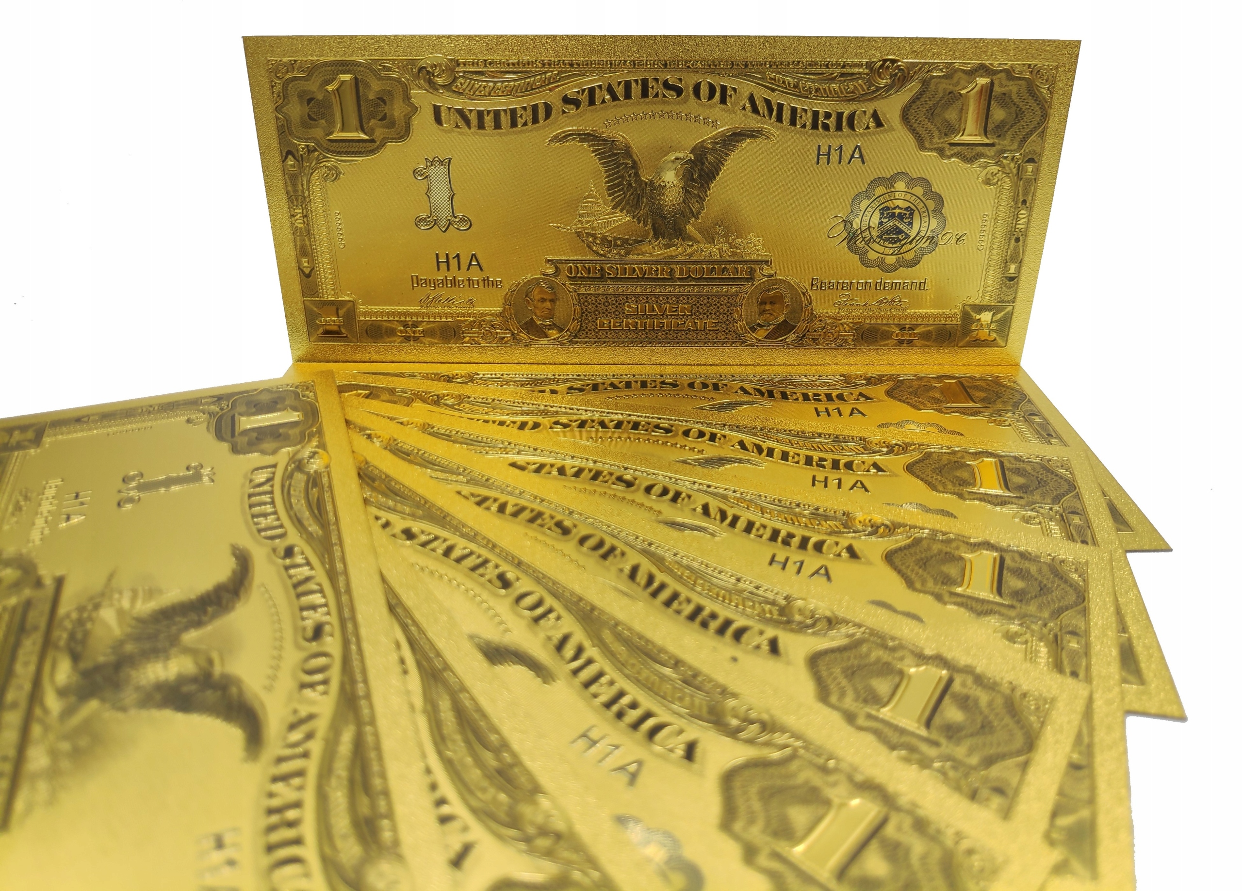 Точная копия американской банкноты из серии 1899 года, изготовленная из ПВХ и покрытая золотой фольгой.
