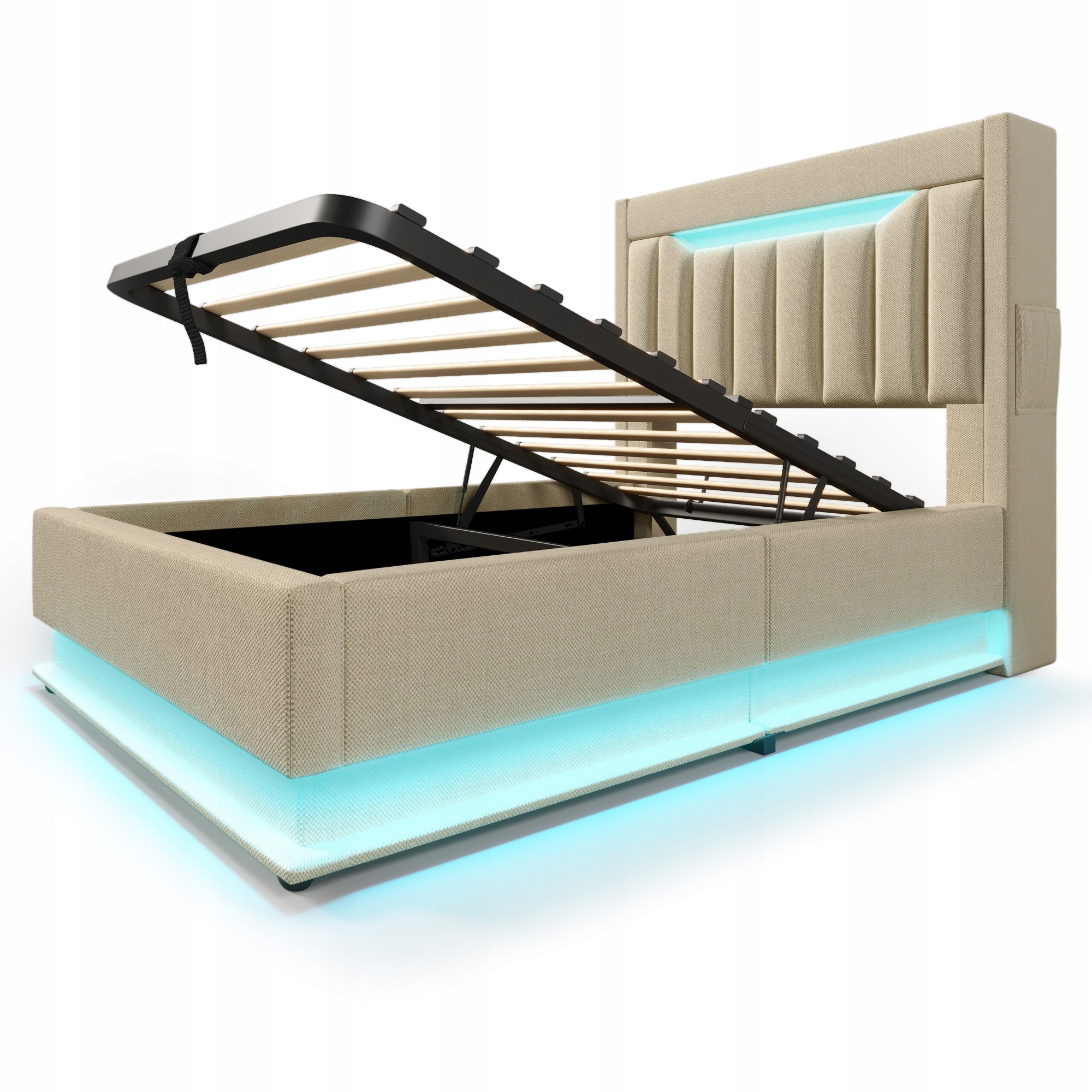 Окруженная односпальная кровать с размерами 90x200 см с изголовью с хранением, USB и портами типа C, светодиодным освещением в изголовке и ноге кровати и гидравлическим купе для хранения, бежево, льна. (Матрас не включен в цену)