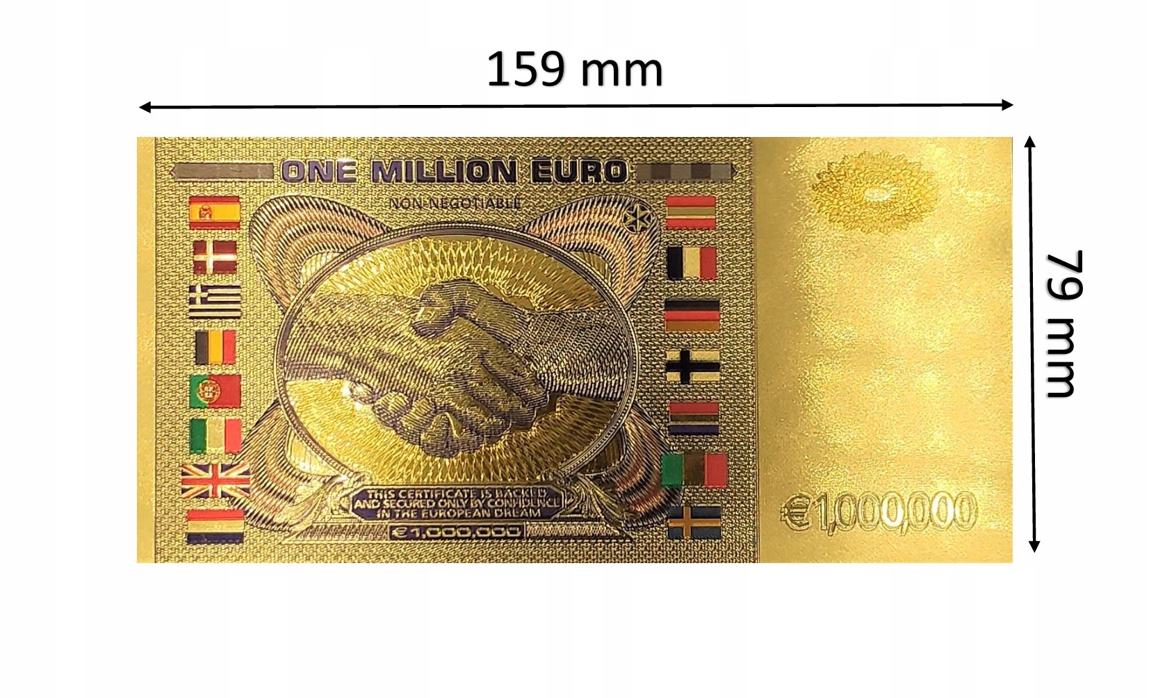 На оборотной стороне, помимо номинала в 1 000 000 евро и отметки о том, что это не официальное платежное средство, мы увидим большой символ валюты, окруженный 12 звездами.