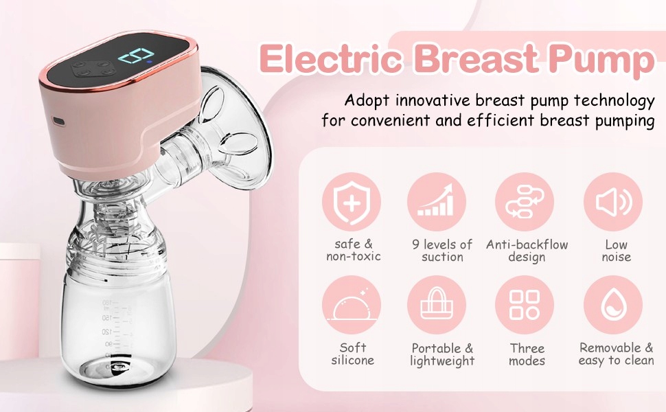 <ул>- Приспособленный и широкоугольный дизайн - электрический молокоотсос идеально адаптируется к разным размерам груди благодаря широкоугольному дизайну 107° и эллиптической внутренней кривизне, благодаря чему молокоотсос лучше адаптируется к груди и телу. Герметичность и мощность всасывания лучше. Овальная форма циферблата с мягким, гладким, гибким краем может вращаться на 360 градусов, поэтому вы можете легко настроить его положение под форму груди.