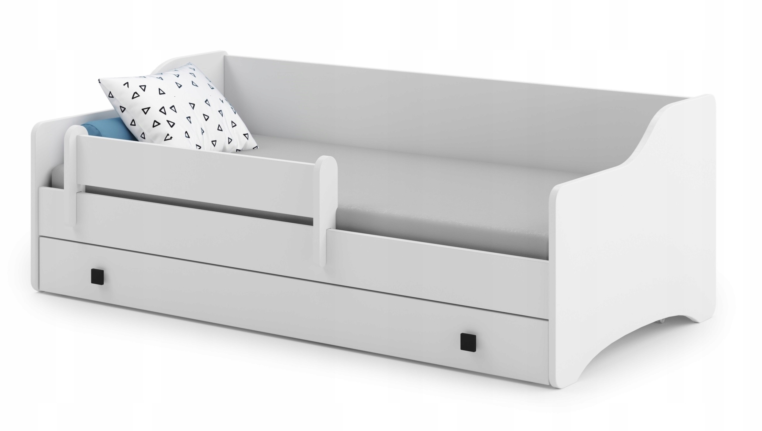 детская кровать Eryk - это красивая и стильная детская кроватка, которая идеально подойдет в комнате маленького мальчика. Корпус кровати изготовлен из высококачественной тарелки, а рама изготовлена из натуральной сосновой древесины. Сплошная конструкция и округлые края гарантируют долговечность и безопасность использования. У кроватки есть ящик с декоративными ручками и подвижный барьер, который обеспечит безопасный сон.