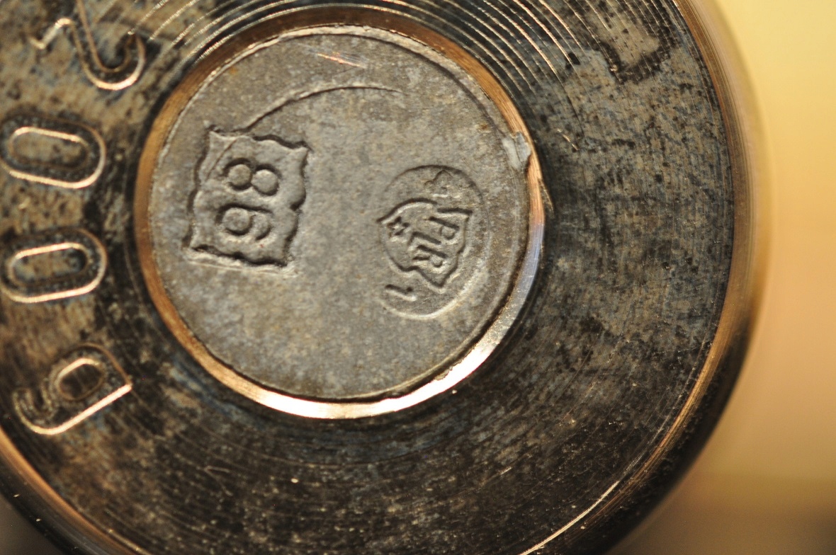 Знаки легализации на буртиках больших гирь, на донышках семи самых маленьких и на пластинах - единые: