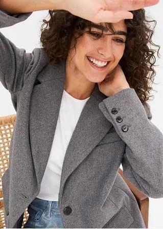 Серый однобортный пиджак из смесовой шерсти – элегантное предложение для офиса и официальных мероприятий. Классический крой и высококачественный материал обеспечивают комфорт ношения и неподвластный времени стиль. Прекрасно сочетается как с брюками, так и с юбками.