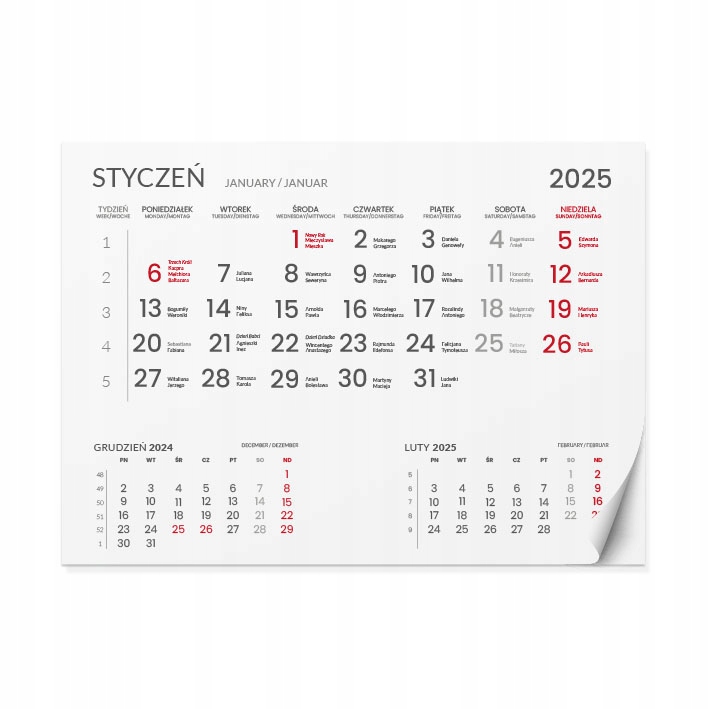 ✅ Четкий и разборчивый календарь на польском языке , напечатанный на офсетной бумаге плотностью 90 г, 12 листов (12 месяцев + блокнот). названия месяцев и недель указаны на 3-х языках (польском, английском, немецком) с указанием важных праздников и именин