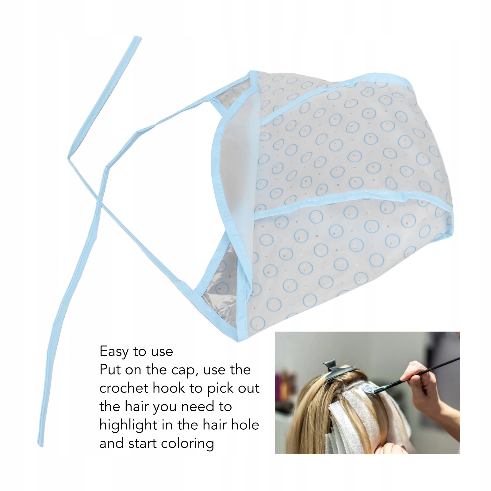 2. ЛЕГКО ИСПОЛЬЗОВАТЬ: колпачок для краски для волос прост в использовании, наденьте колпачок, выберите волосы, которые хотите выделить, в отверстии для волос с помощью вязального крючка и начните красить волосы.