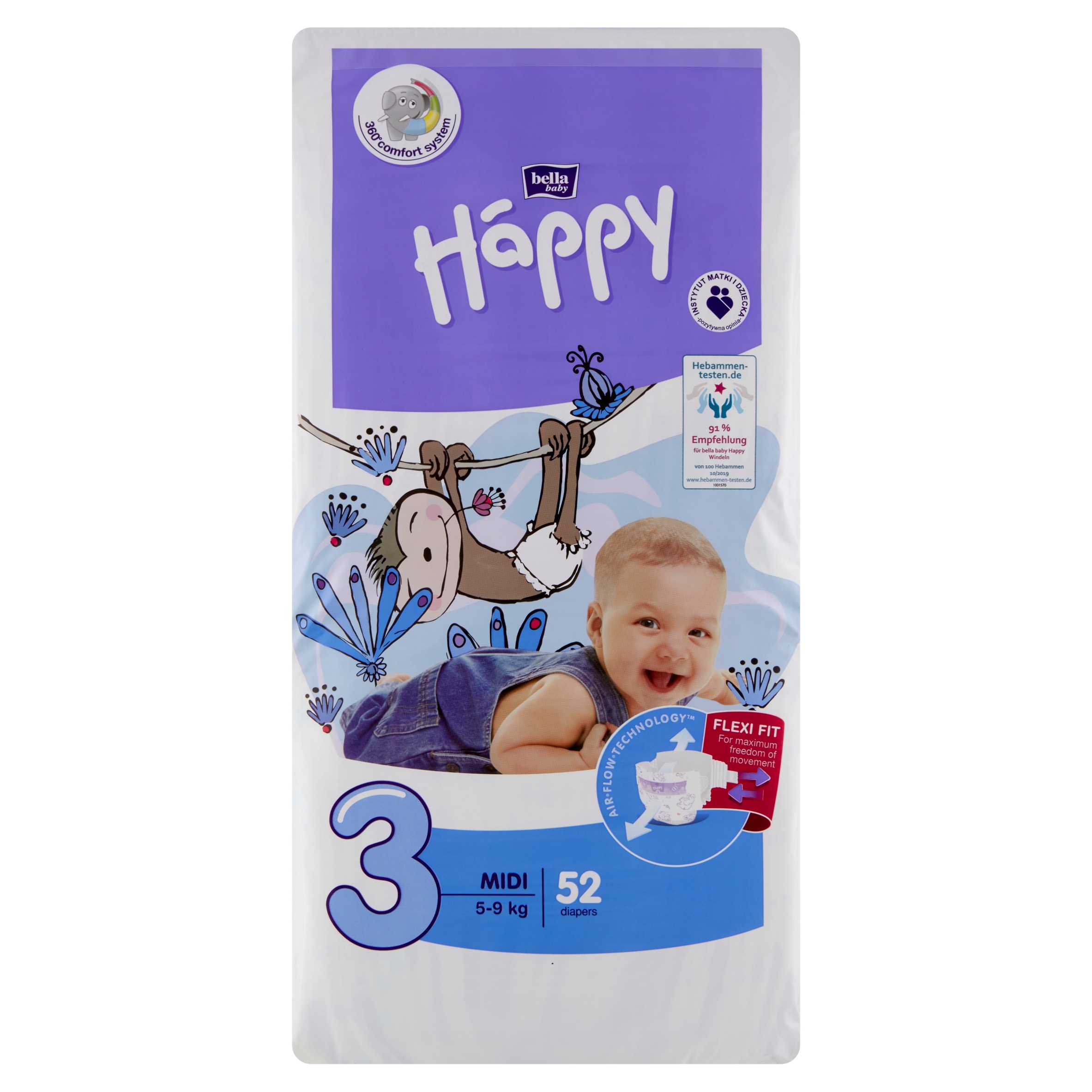 Система комфорта 360°, используемая в подгузниках Happy размеров Midi-Junior Extra. – это набор функций, обеспечивающих удобство и комфорт все более подвижному ребенку. Благодаря этому подгузник идеально прилегает к телу, не стесняет движений и не вызывает потертостей.