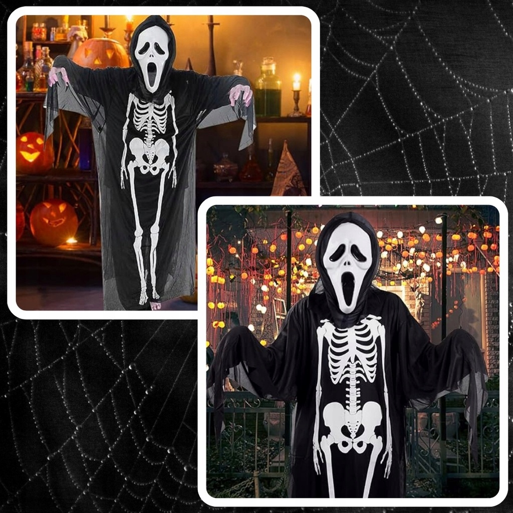 ✅ Да, костяной принт и накидка создают жуткий эффект скелета, идеально подходящий для Хэллоуина.