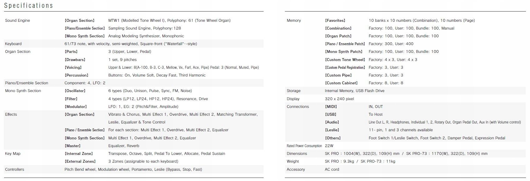 Орган одноручной, 61 клавиша-водопад, 4 генератора звука (орган, фортепиано, оркестр, моносинтезатор), 100 заводских комбинаций + 100 пользовательских комбинаций, 10 кнопок быстрого выбора любимых комбинаций, высота тона и модуляция, цветной дисплей с разрешением 320 х 240 пикселей, MIDI-вход/выход, 11-контактный разъем для колонки Leslie, вход Aux, размеры 1004 х 322 х 109 мм, вес 9,3 кг