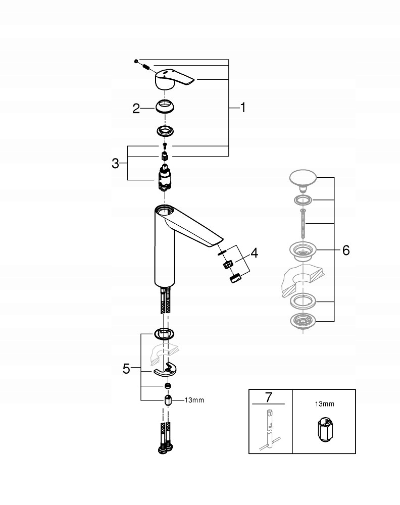 Для отдельно стоящих умывальниковустановка на одно отверстиеметаллический рычагGROHE SilkMove керамический картридж 28 ммрегулируемый ограничитель расхода воды с ограничителем температурыGROHE StarLight хромированная отделкаМуссист GROHE EcoJoy 5,7 л/минРегулируемый пенис GROHE AquaGuideGROHE FastFixationСистема быстрой установкинабор для сливагибкие соединительные шланги