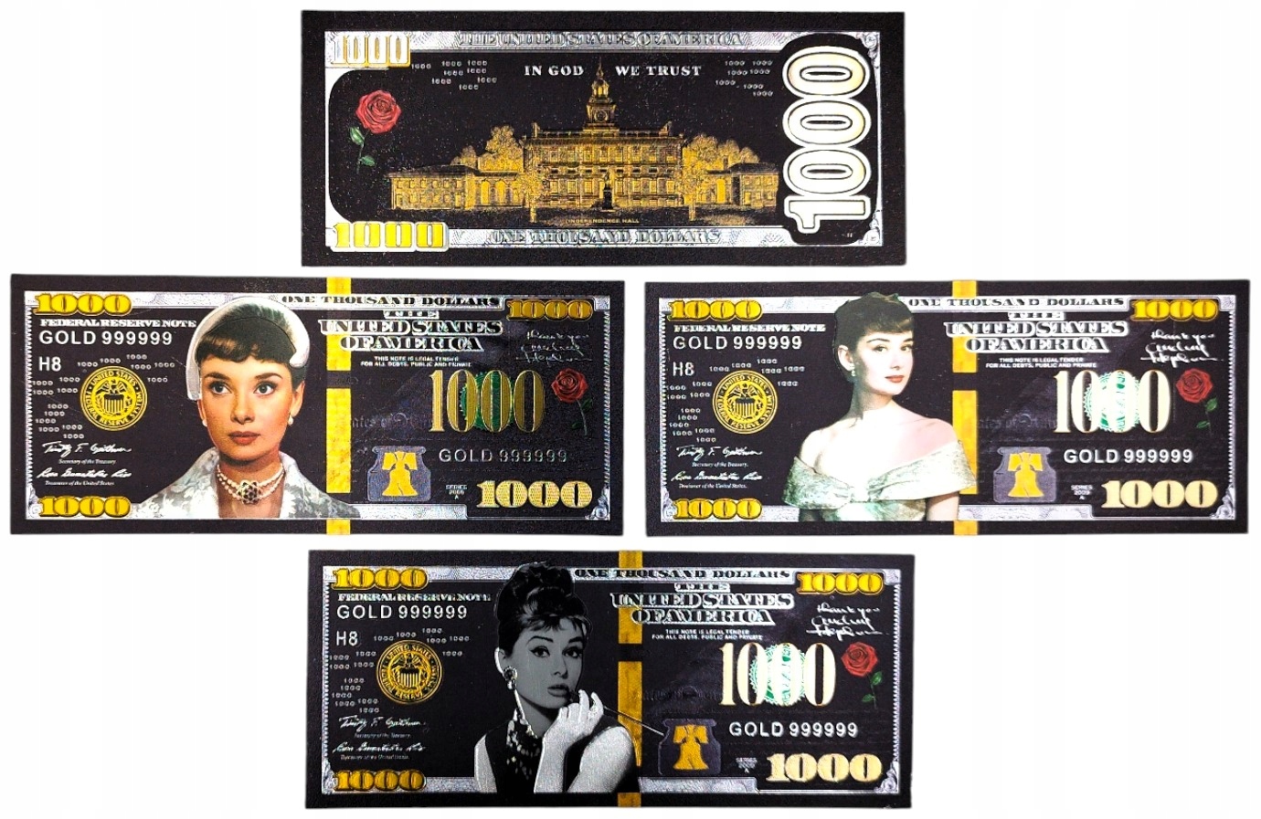 Красивый набор позолоченных банкнот в ЧЕРНОМ варианте с изображением Одри Хепберн.
