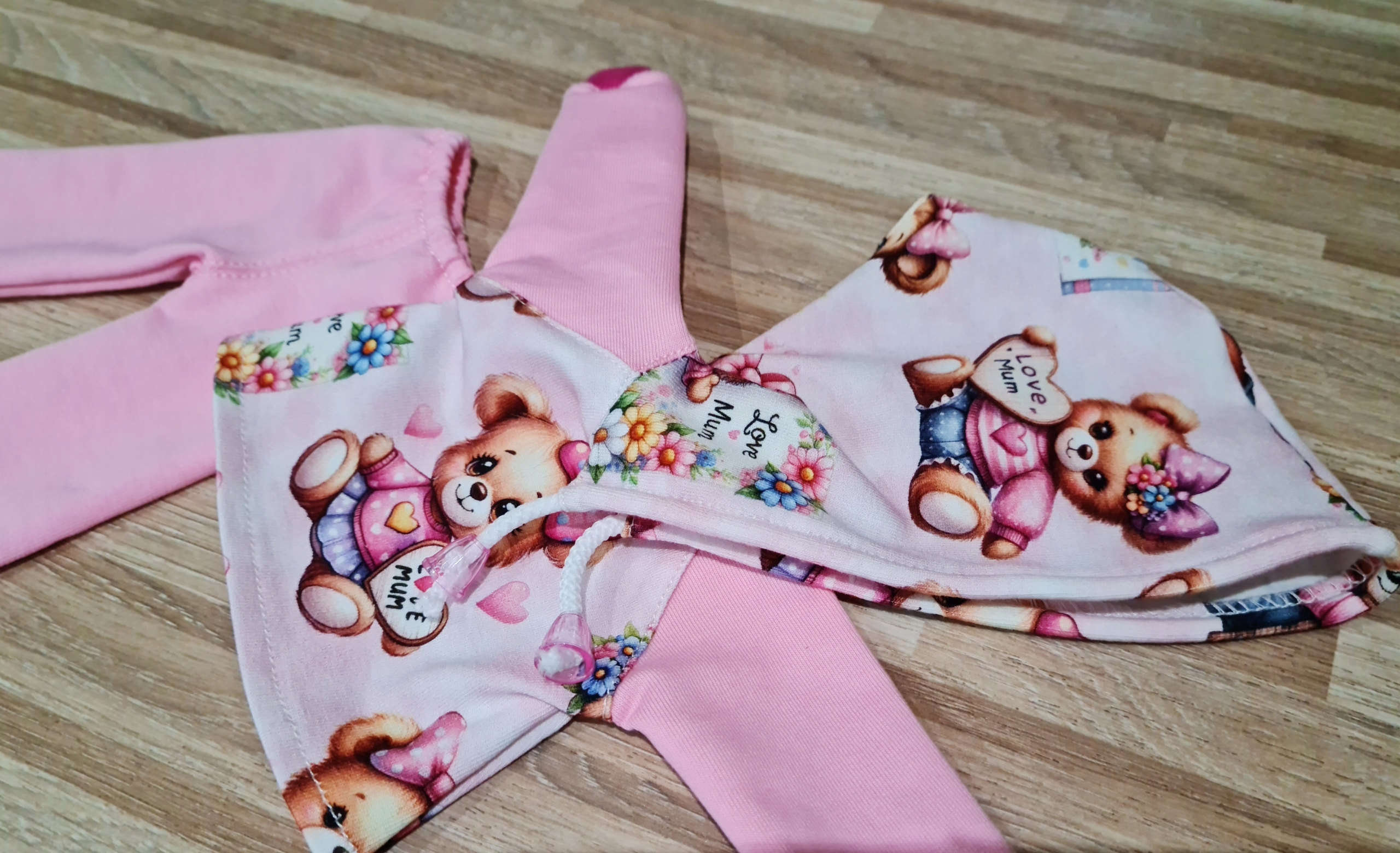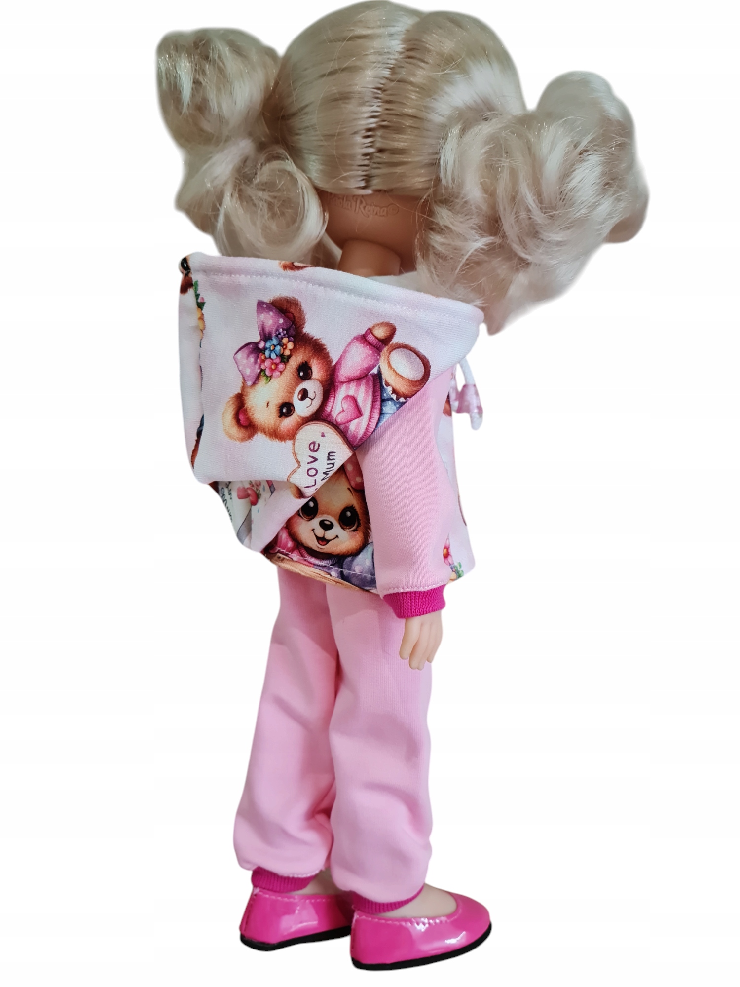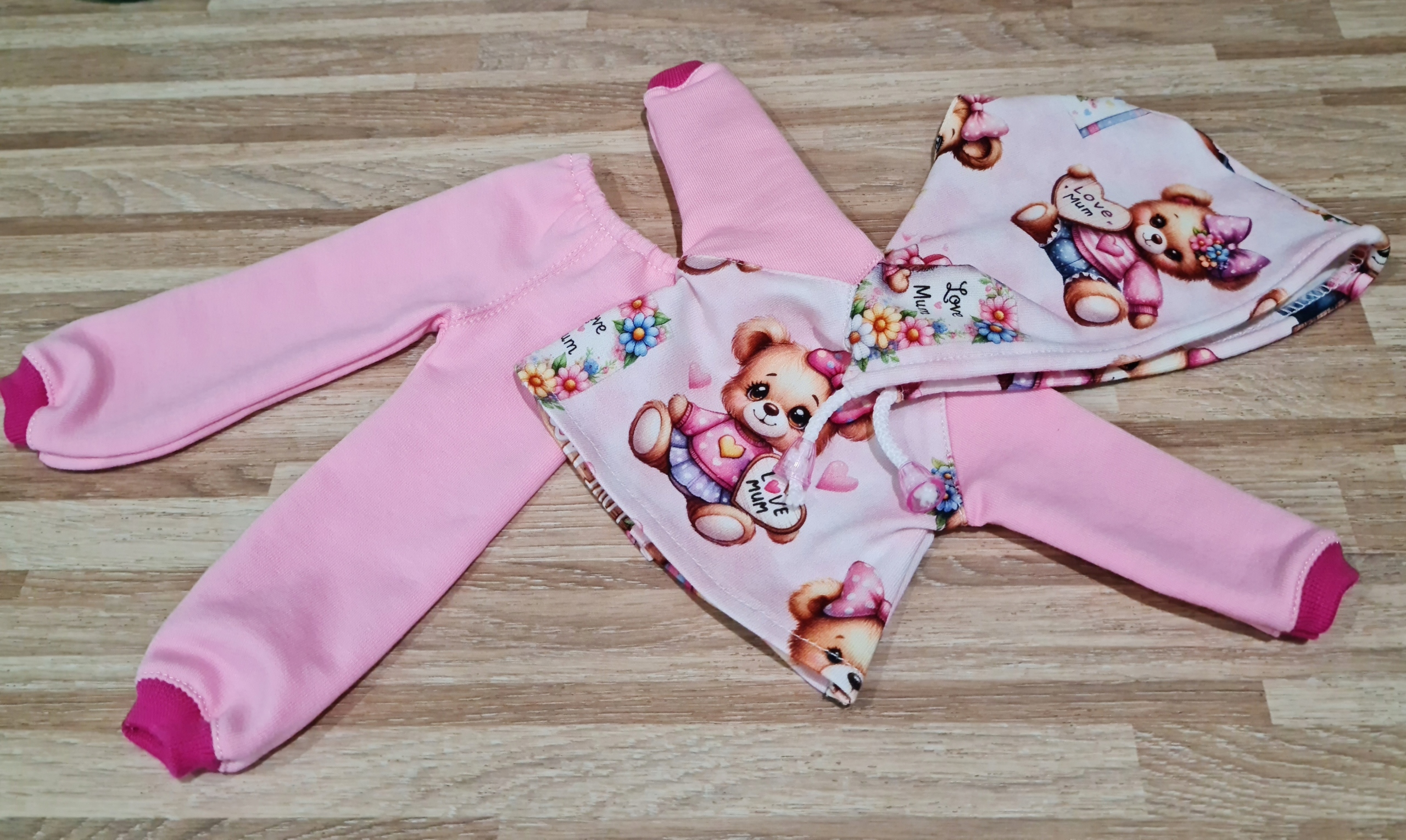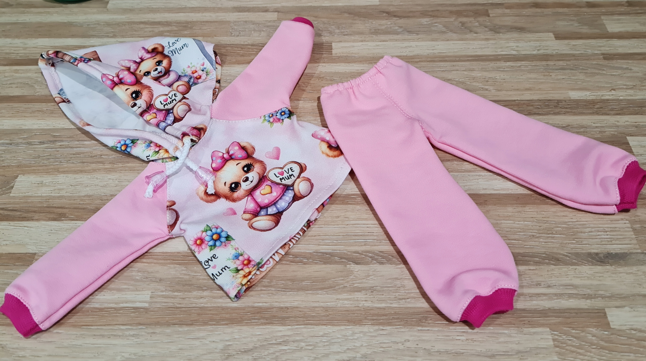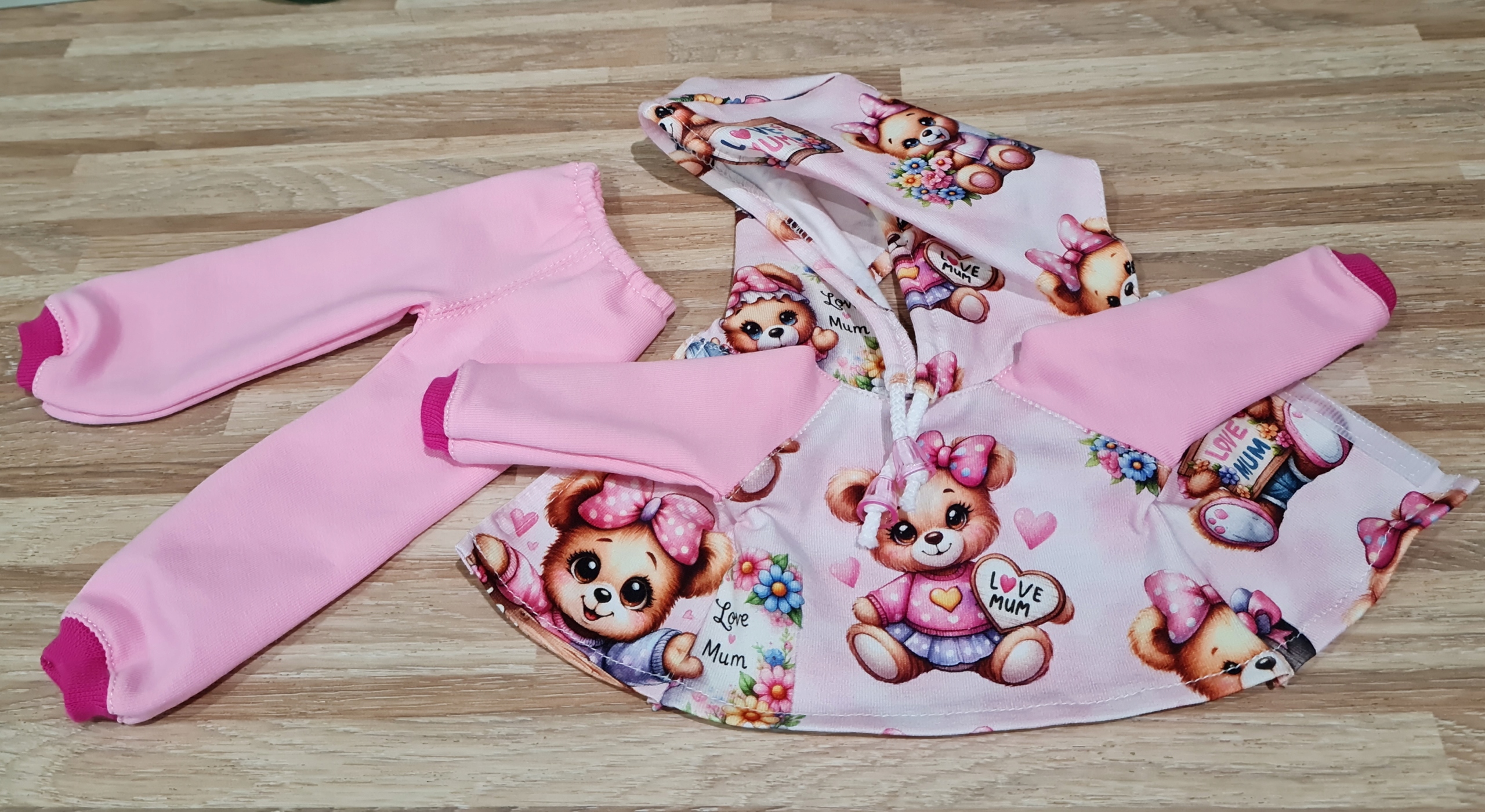 из 2 шт. Цифровая печать. Капюшон имеет стрижку сзади, поэтому мы можем положить длинные волосы куклы, кроме того, нарисованная струна с наконечниками, которые можно отрегулировать. Толстовка, закрепленная деликатной липучкой. Брюки на эластичной ленте закончились с отводом внизу.