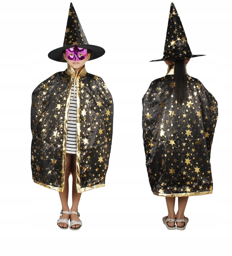 ⭐ Накидка и шляпа черного цвета, украшенные золотыми звездами