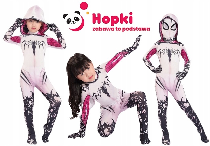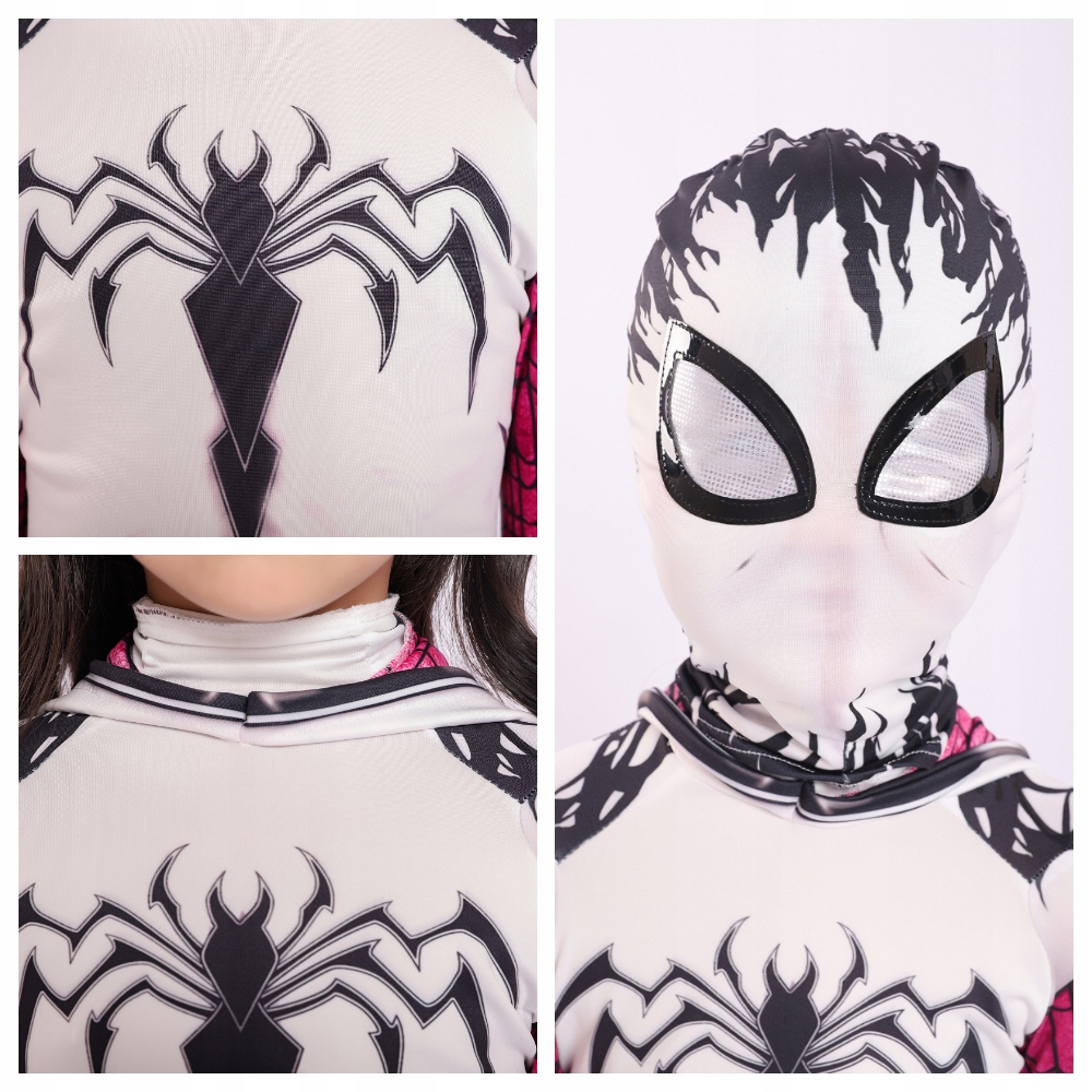 Цельный костюм девушки-паука белого, розового и черного цветов. Хорошо сшит, слегка эластичен, застегивается на молнию. Благодаря нашему предложению каждый поклонник этой супергероини перевоплотится в ее любимого персонажа комиксов. Интересный костюм позволит вам совершить путешествие в мир супергероев, что позволит вам надолго вспомнить детство.