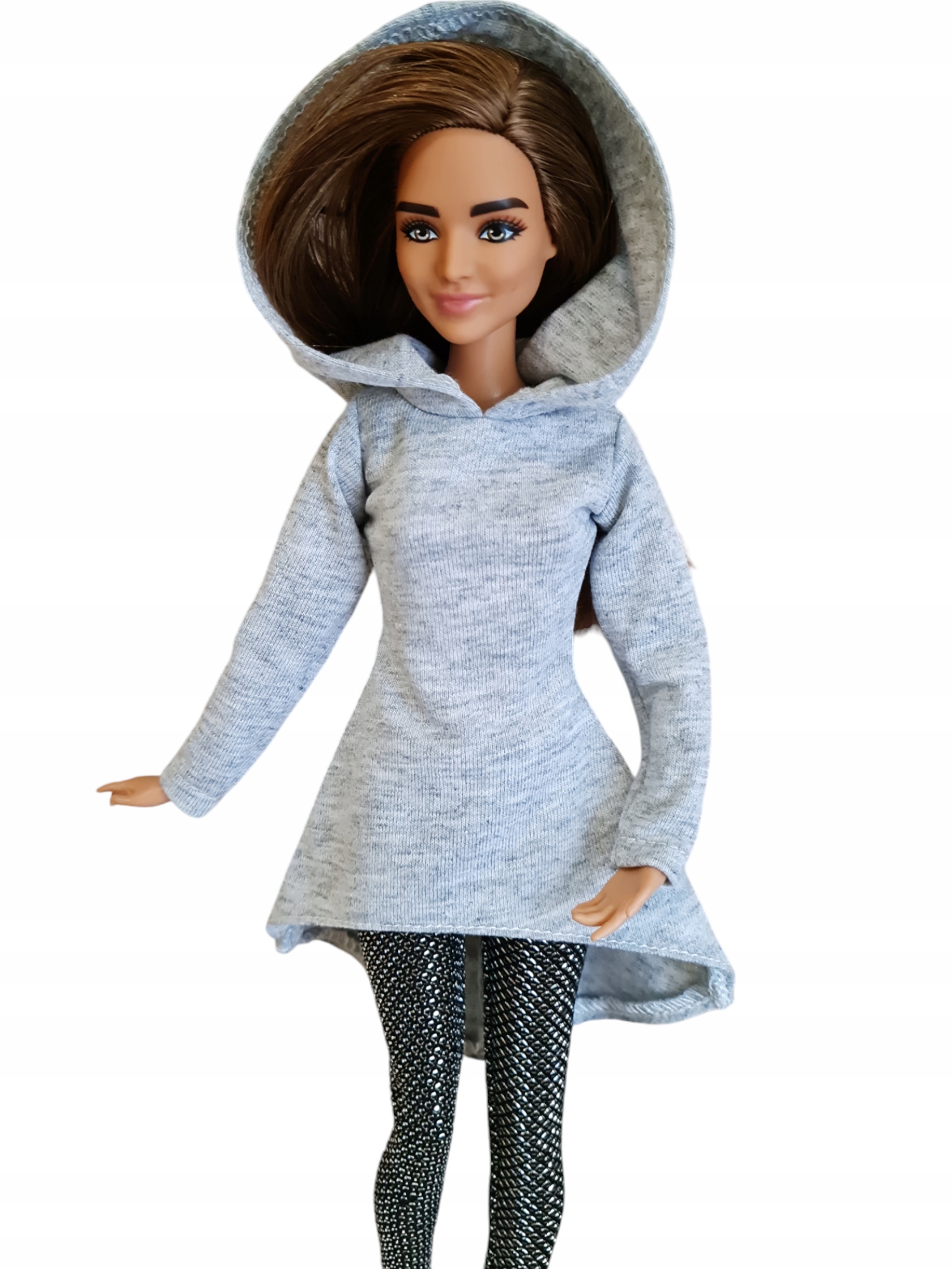 Тематика: В продаже платье-туника с капюшоном. Выполнено из меланжевого трикотажа. Сзади на капюшоне имеется прорезь, через которую можно пропустить волосы куклы. Застегивается на изящную липучку.