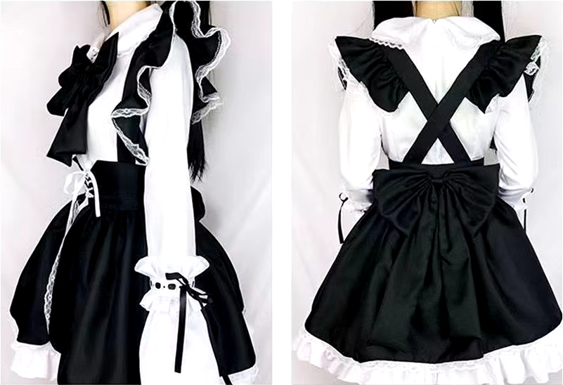 Maid, вдохновленный стилем аниме, полным элегантности и девичьего обаяния, идеально подходит для поклонников японской эстетики. Платье сочетает в себе черную юбку с белой кружевной отделкой, большой лук и рукава, украшенные тонкими лентами. Идеально подходит для косплея, фотосессий или тематических событий, предоставляет уникальный, стильный вид, который выделяется из стандартных костюмов.