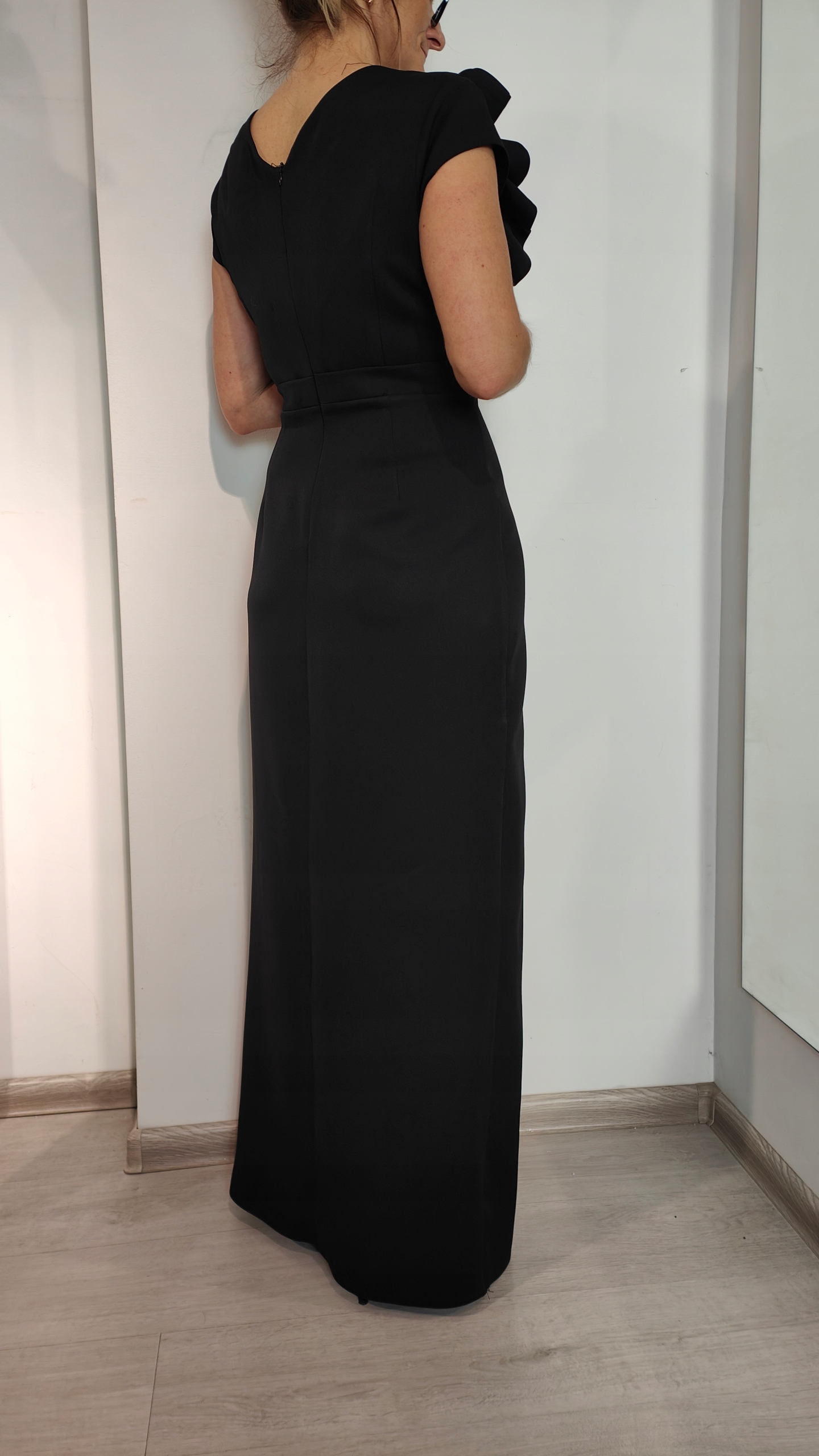 Длина: Платье достигает земли, что подчеркивает его вечерний характер, а вырез на передней части добавляет ноты чувственности. слово.
