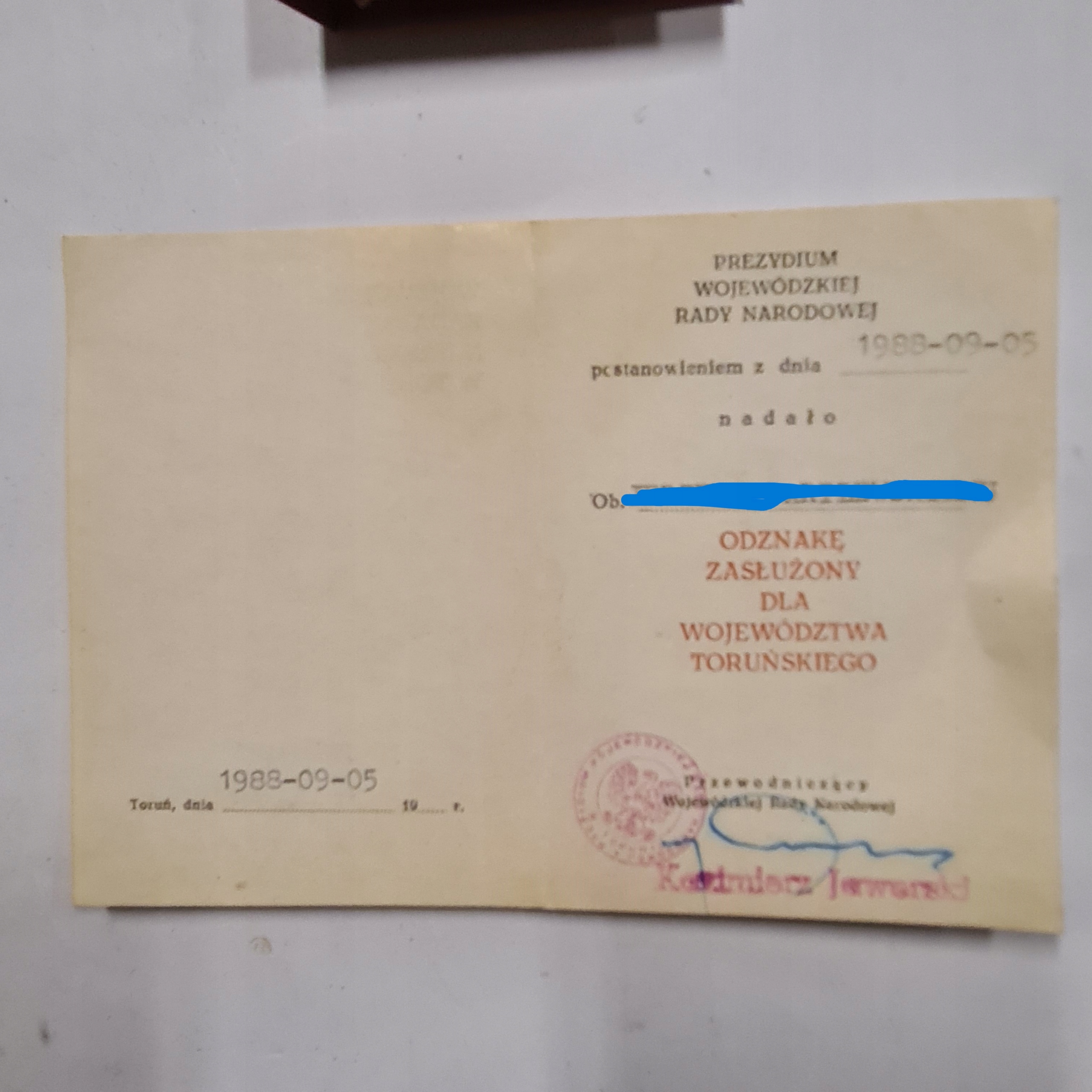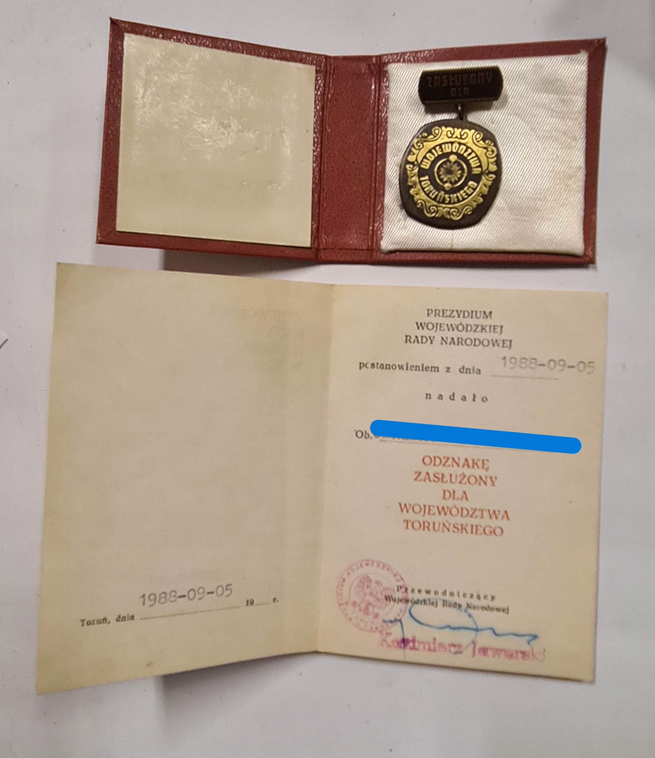 odznaka z legitymacją+ etui Zasłużony dla Województwa toruńskiego