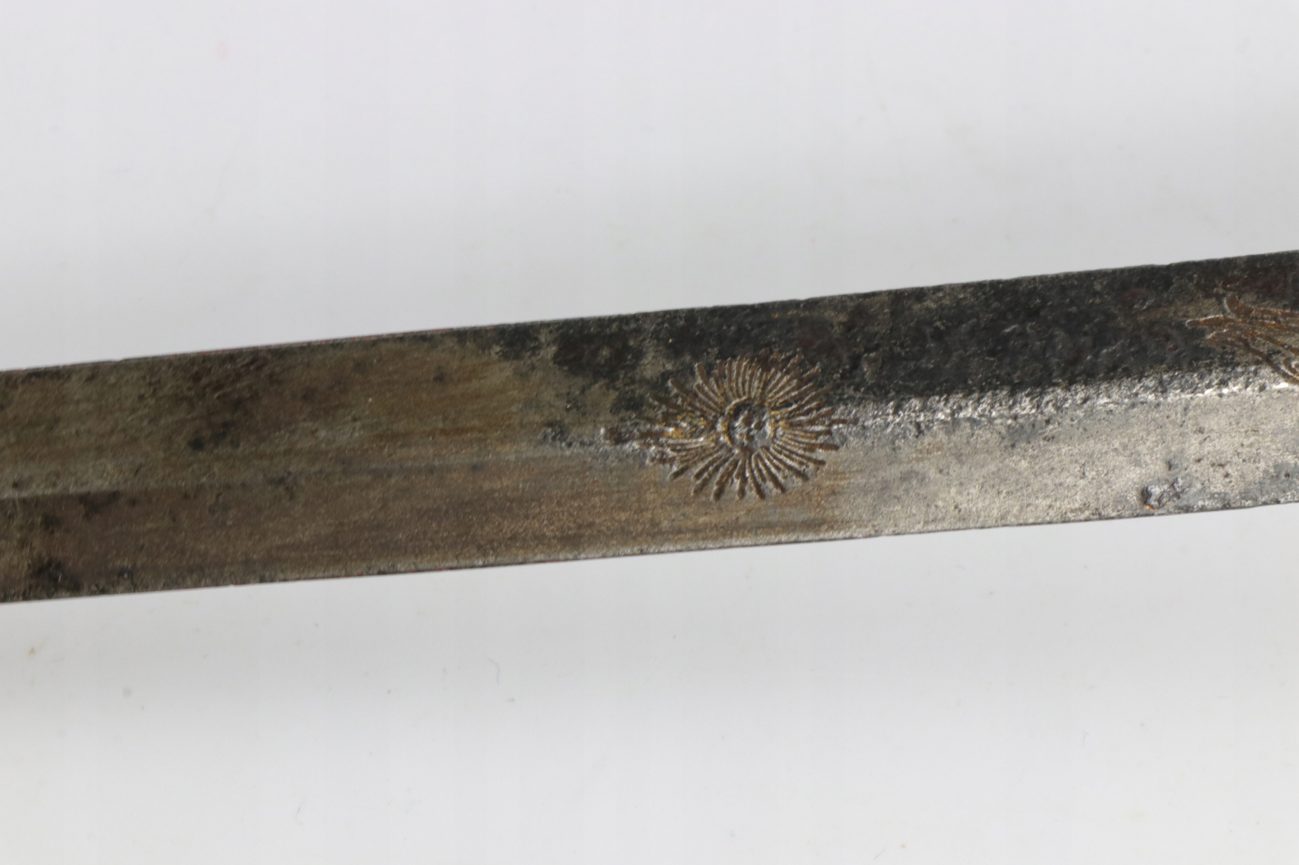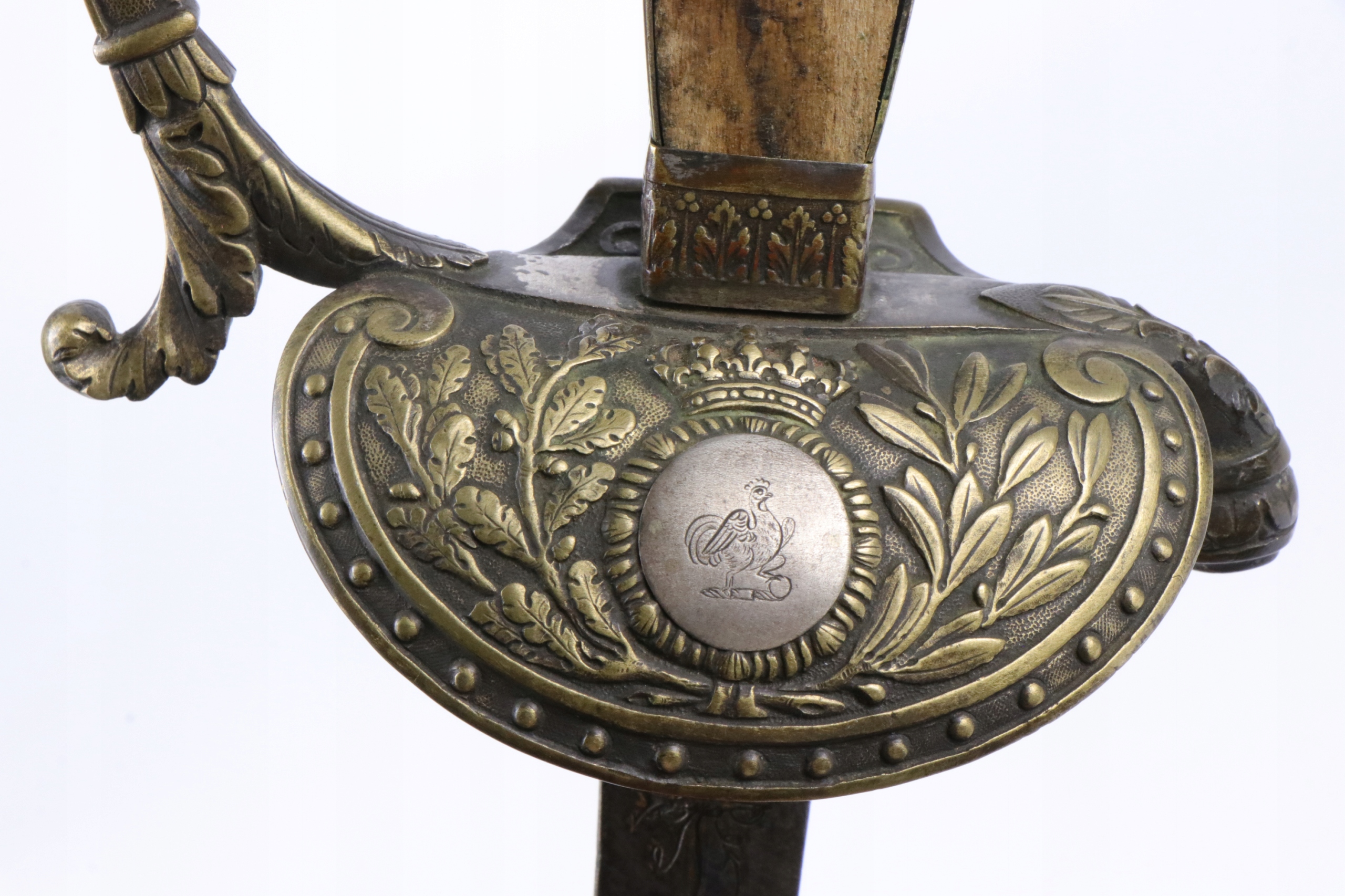 Офицерская шпага периода Реставрации Бурбонов (характерный петух), 1814-1830 гг. Первоначально рукоять была посеребрена. В царский знак вписана мемориальная доска с серебряным петухом в окружении лаврово-дубового венка. На клинке присутствуют символы, в том числе знак солнца.
