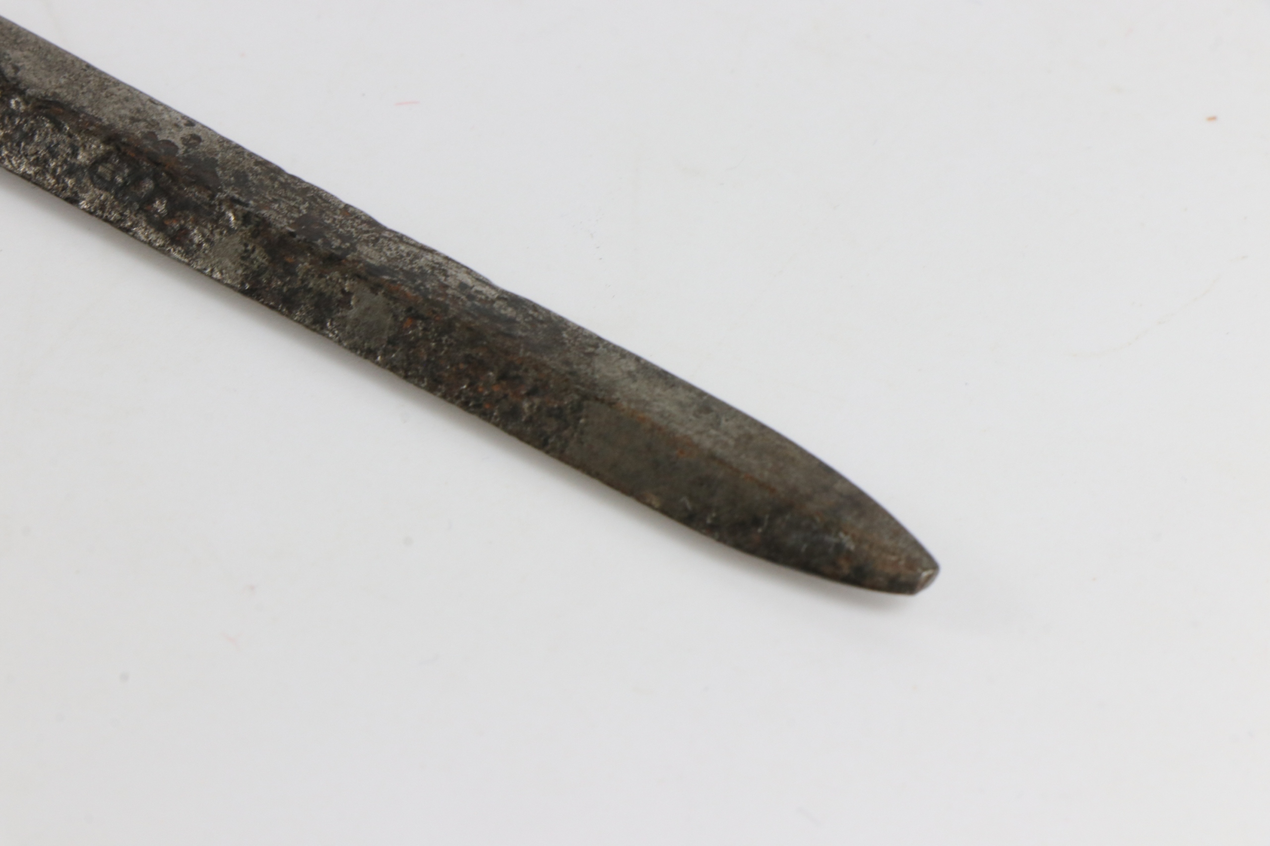 Как видно на фотографиях. На рукояти отсутствуют деревянные накладки. На лезвии имеются незначительные следы коррозии, некоторое напыление, лезвие не затачивалось. Не знаю, существует ли оригинальная длина клинка.