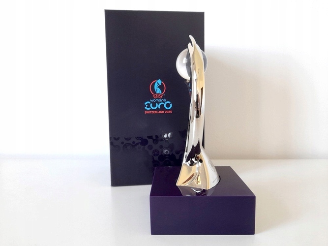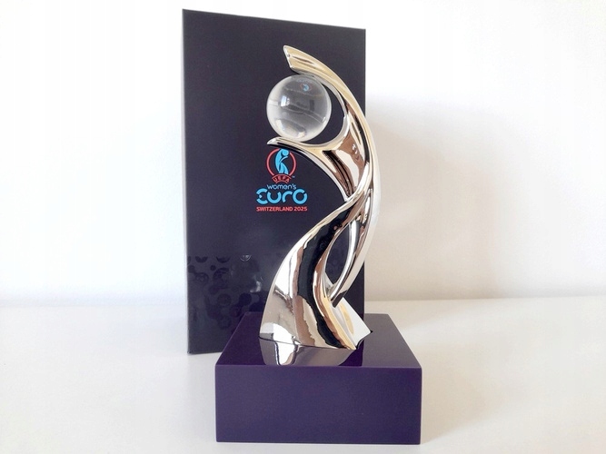 Описание: Памятная официальная большая копия трофея женского чемпионата Европы по футболу Евро-2025 в Швейцарии. Он изготовлен из металла и пластика, с надписями и логотипом УЕФА, идентичными тем, что на трофее. Он помещен на акриловую основу, подписанную внизу. Реплика помещена в темно-синий футляр, в картонную упаковку с голограммой и логотипом Евро-2025. Это официальный сувенир чемпионата Европы по футболу среди женщин 2025 года.