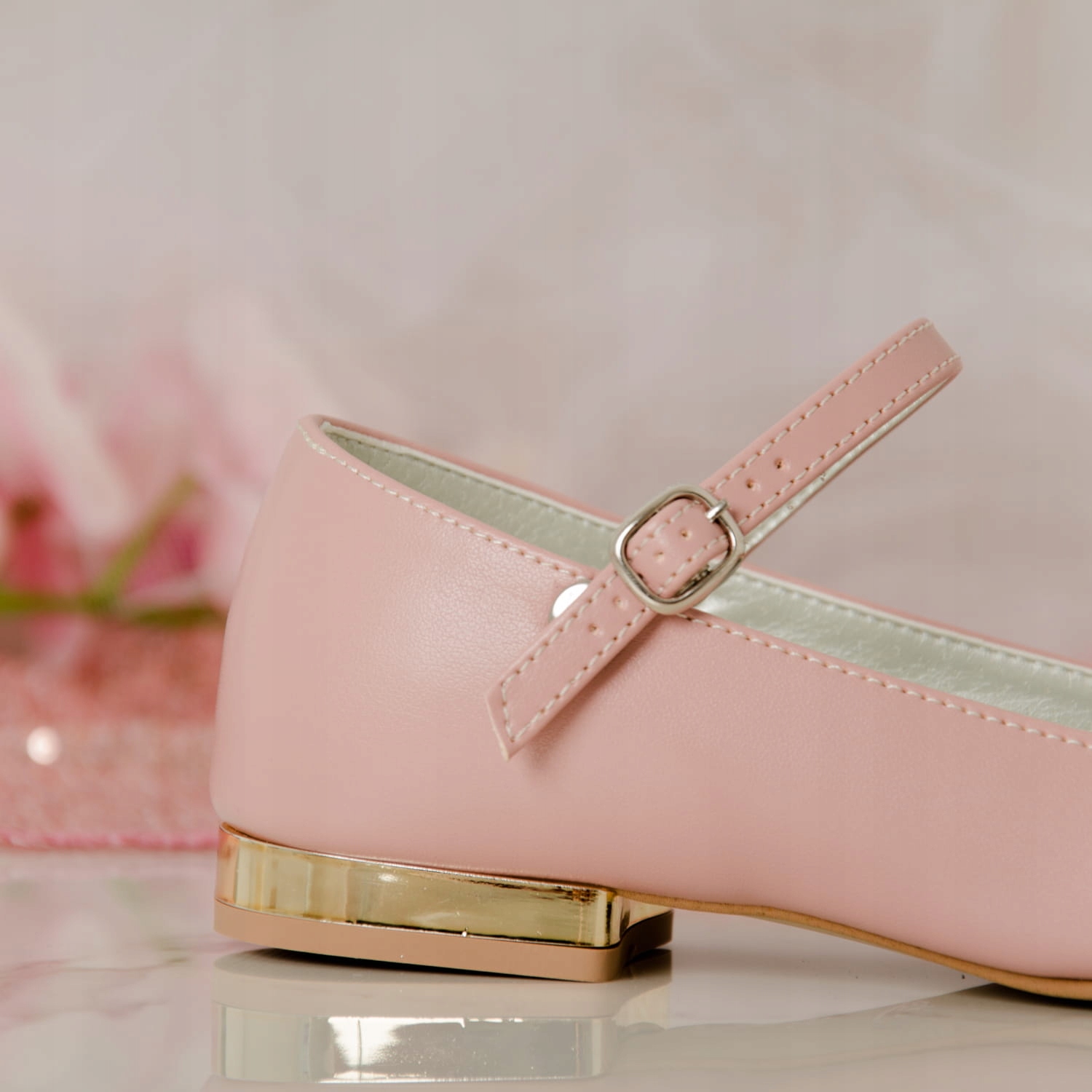 Элегантная, скользящая, розовая формальная обувь для девушки. Ну, обувь, благодаря которой они уверенно держатся на ногах. Кроме того, у них есть ремешок, который можно использовать спереди для лучшего содержания ноги или сзади в качестве украшения. Модель на деликатном каблуке с высотой 1 см в золоте. Внешняя часть обуви состоит из экологической кожи, а вставка из натуральной кожи. Классические балерины идеальны как как маскировка в день первого святого причастия, так и во время других праздников и многое другое.