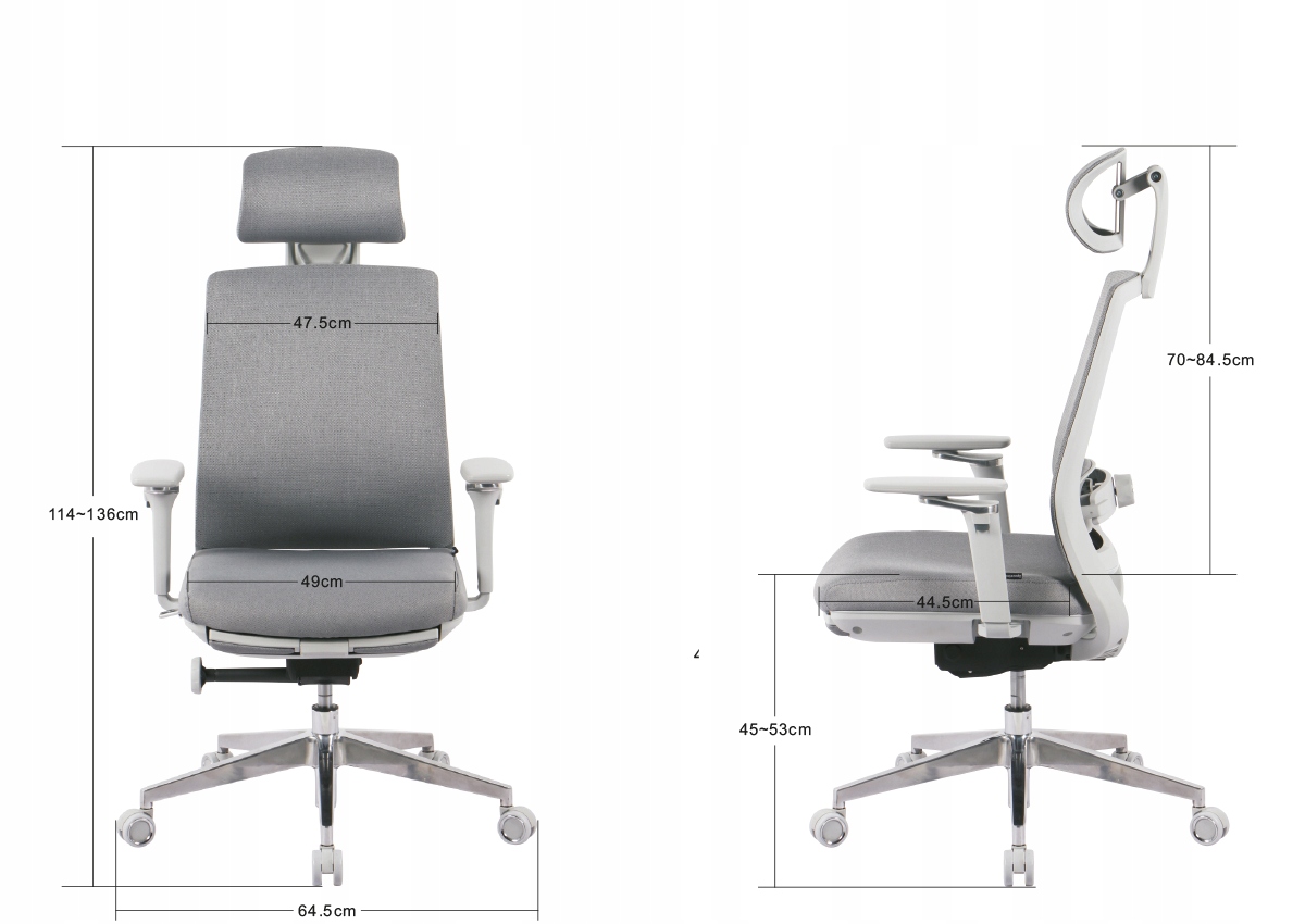 Основа кресла с 5 спицами изготовлена из высокопрочного -качественная сталь хромированная диаметром 64,5 см. Такая конфигурация обеспечивает высочайший уровень устойчивости кресла. Используя мягкие серые колеса диаметром 6 см, мы уменьшаем износ панелей, ковров и других поверхностей.