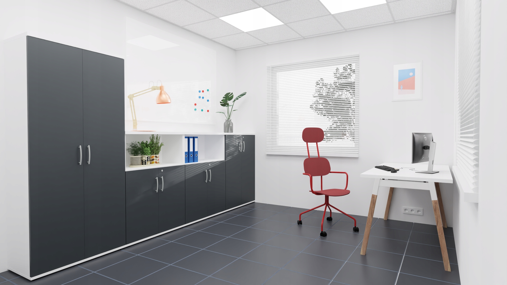 ✅ Современный стол ✅ Высокий закрытый книжный шкаф ✅ Низкий закрытый книжный шкаф ✅ Две низкие, частично закрытые полки