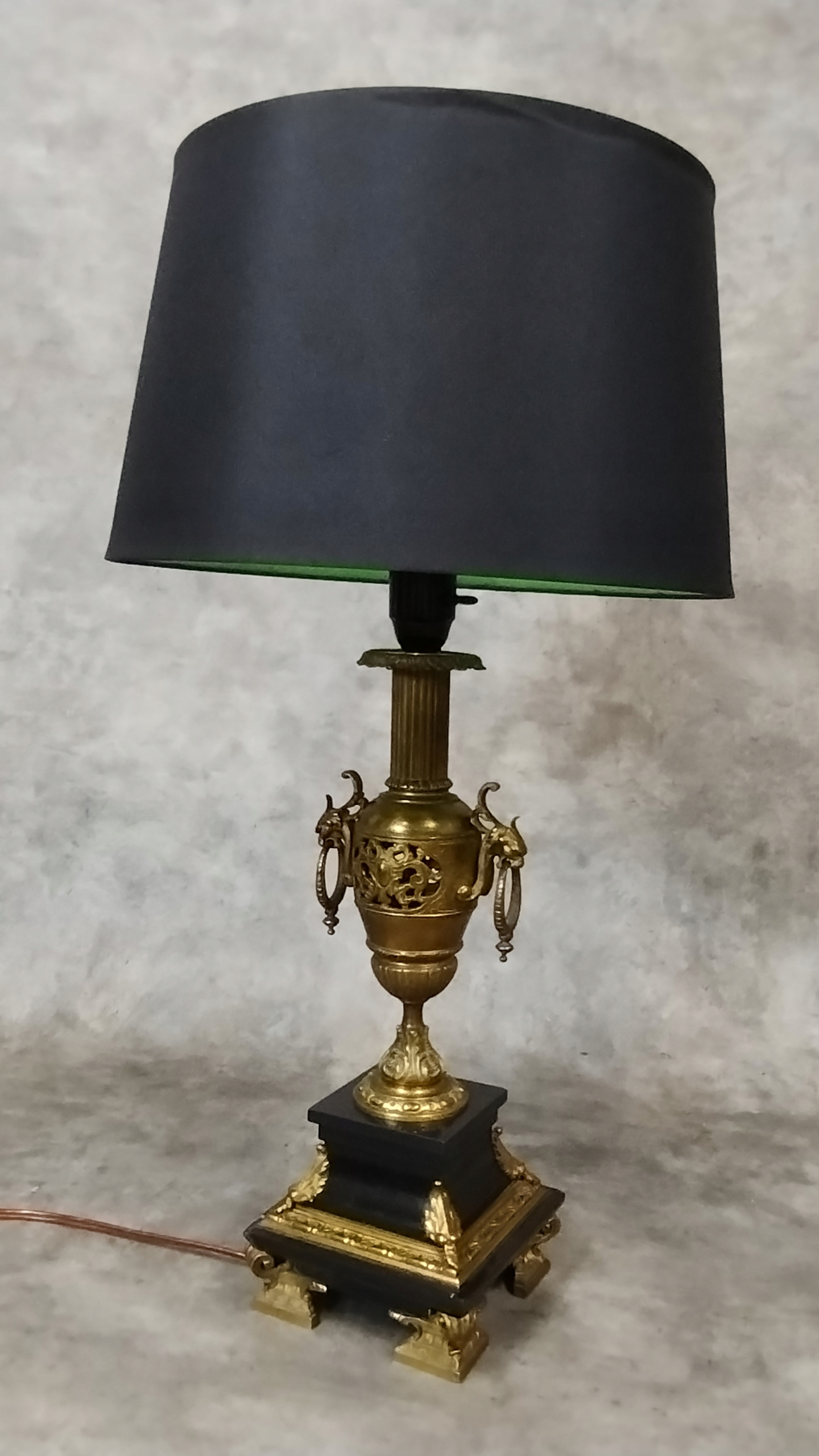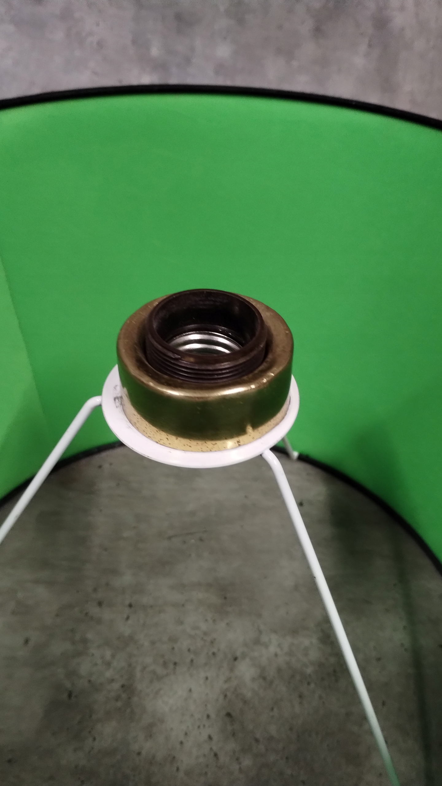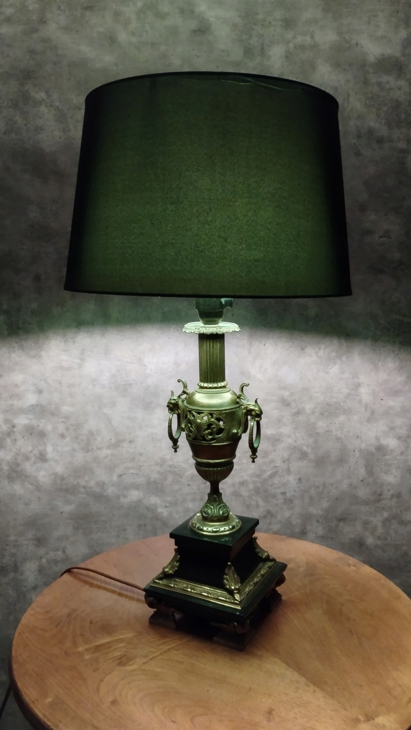 Кабинетная лампа конца XIX века, первоначально с керосиновым цоколем, в 1930-50 годах переоборудована в электрическую лампу, сохранилась в хорошем состоянии, видны следы ремонта, кто-то даже ходил в беда с добавлением одной из ножек, отливка менее детальная, абажур современный, бакелитовая рама имеет поврежденный край, но это не влияет на ее использование, высота 62, диаметр 33.
