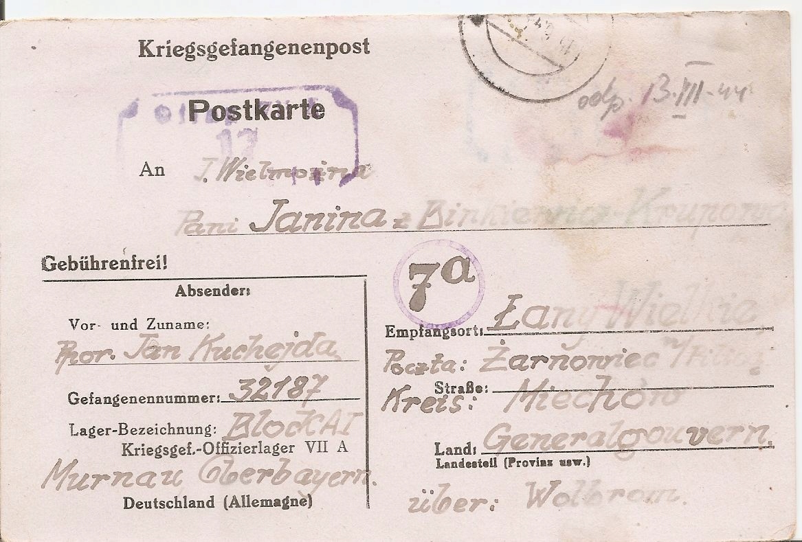 OFLAG VII A -karta -obieg 1944 rok do ŁANY WELKIE -oflag MURNAU