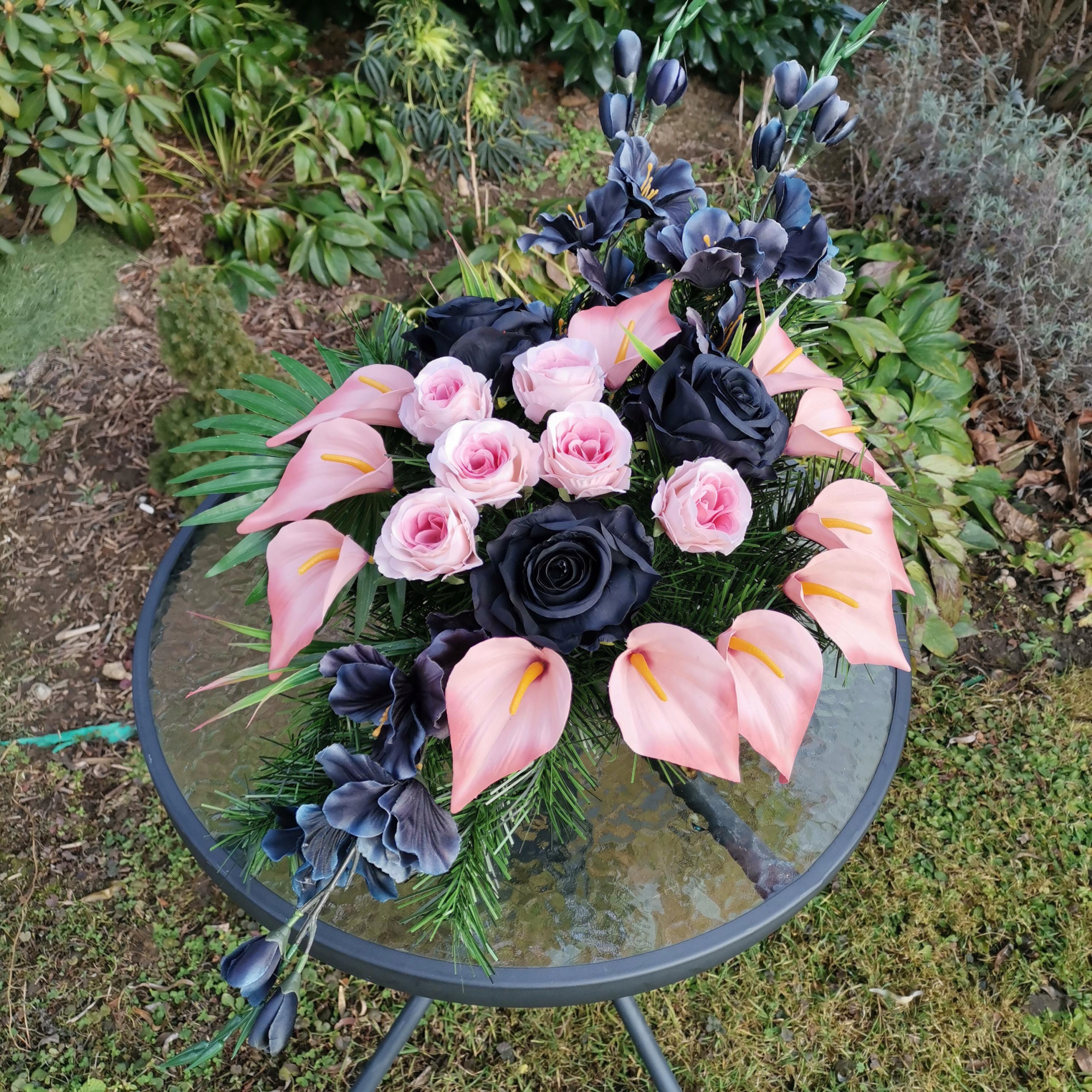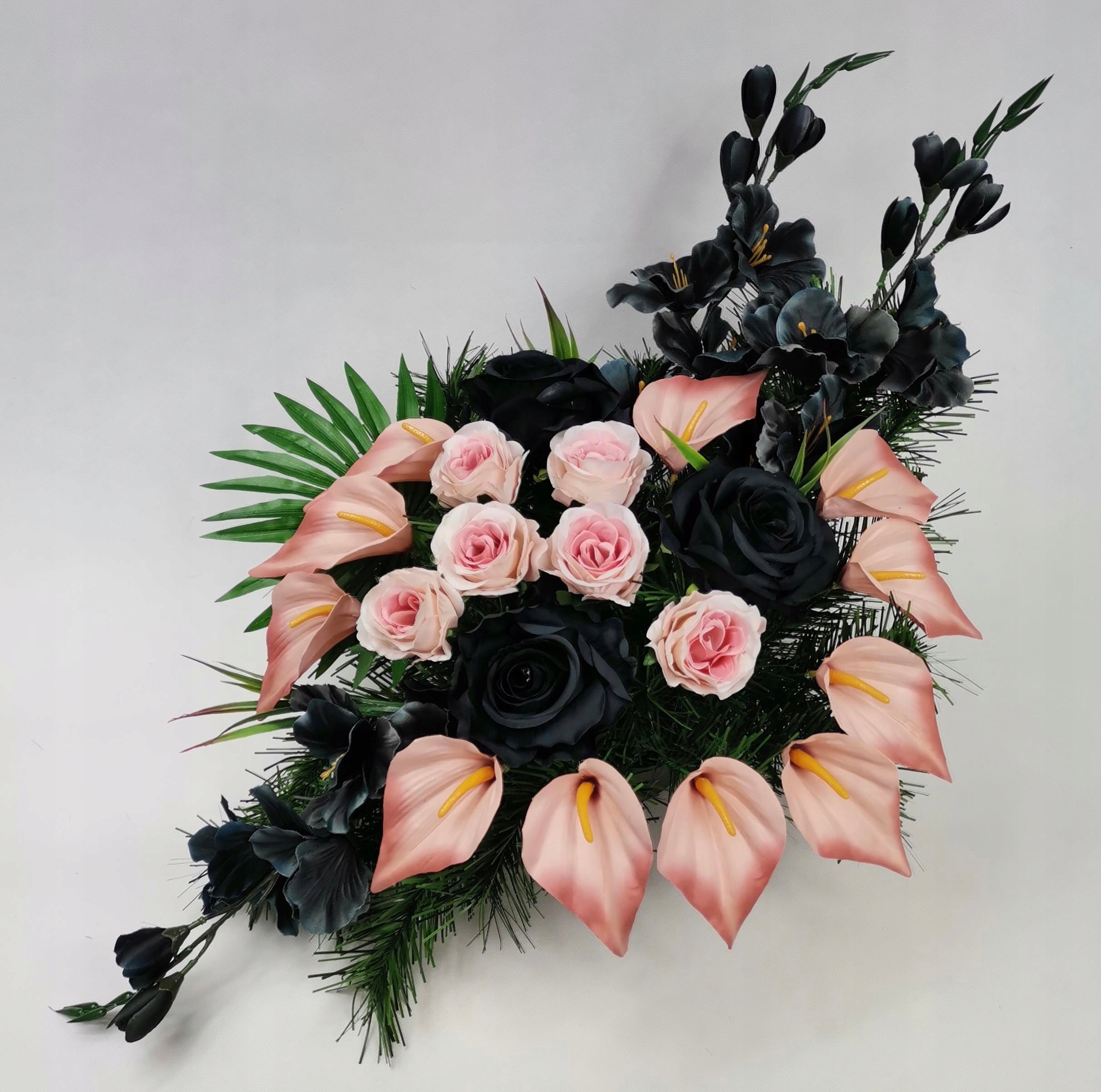 На этом аукционе удлиненное украшение из роз, гладиолусов и калл в розовом и черном цветах, плюс зеленые элементы.