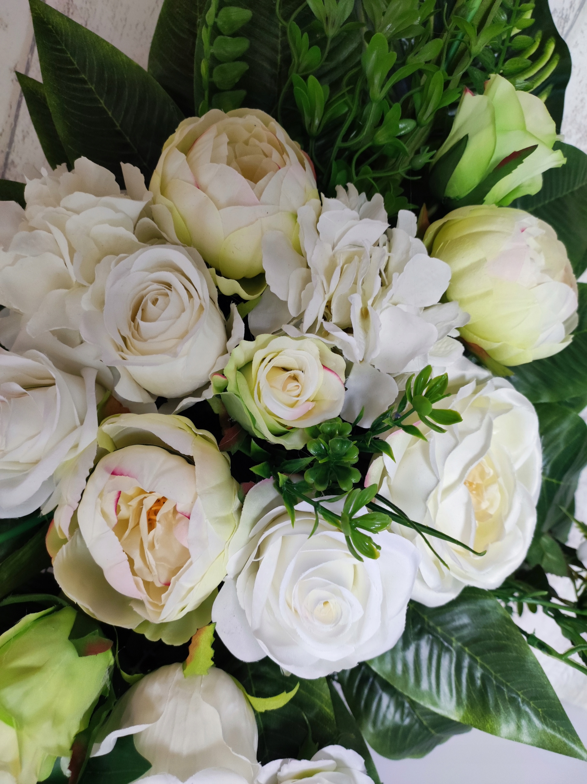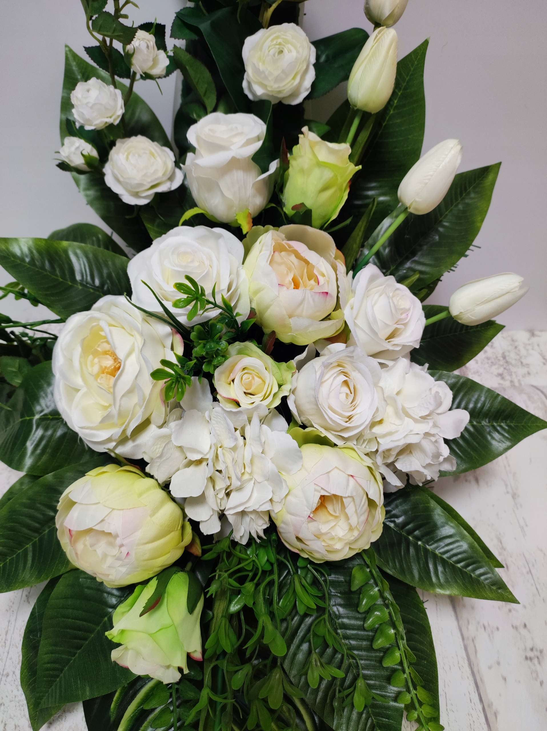 Красивое могильное украшение из искусственных цветов, «полустоящая» композиция на тарелке. Мы сами тщательно составляем наши композиции, благодаря чему трости уникальны и в жизни выглядят еще лучше.