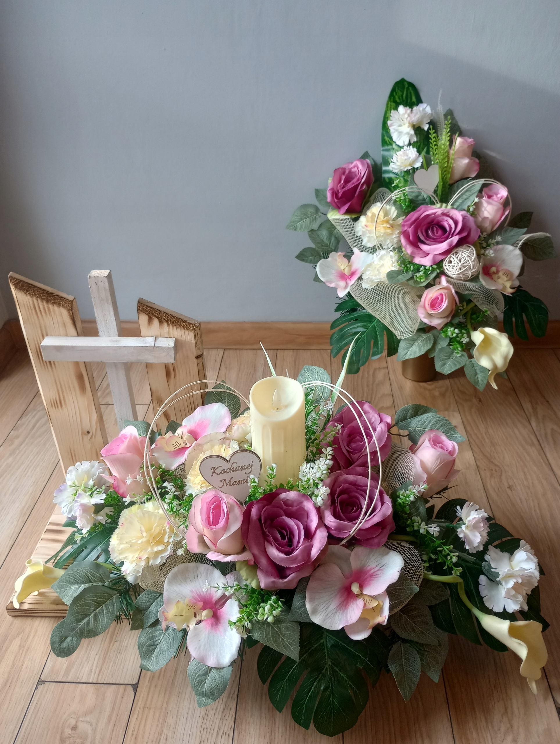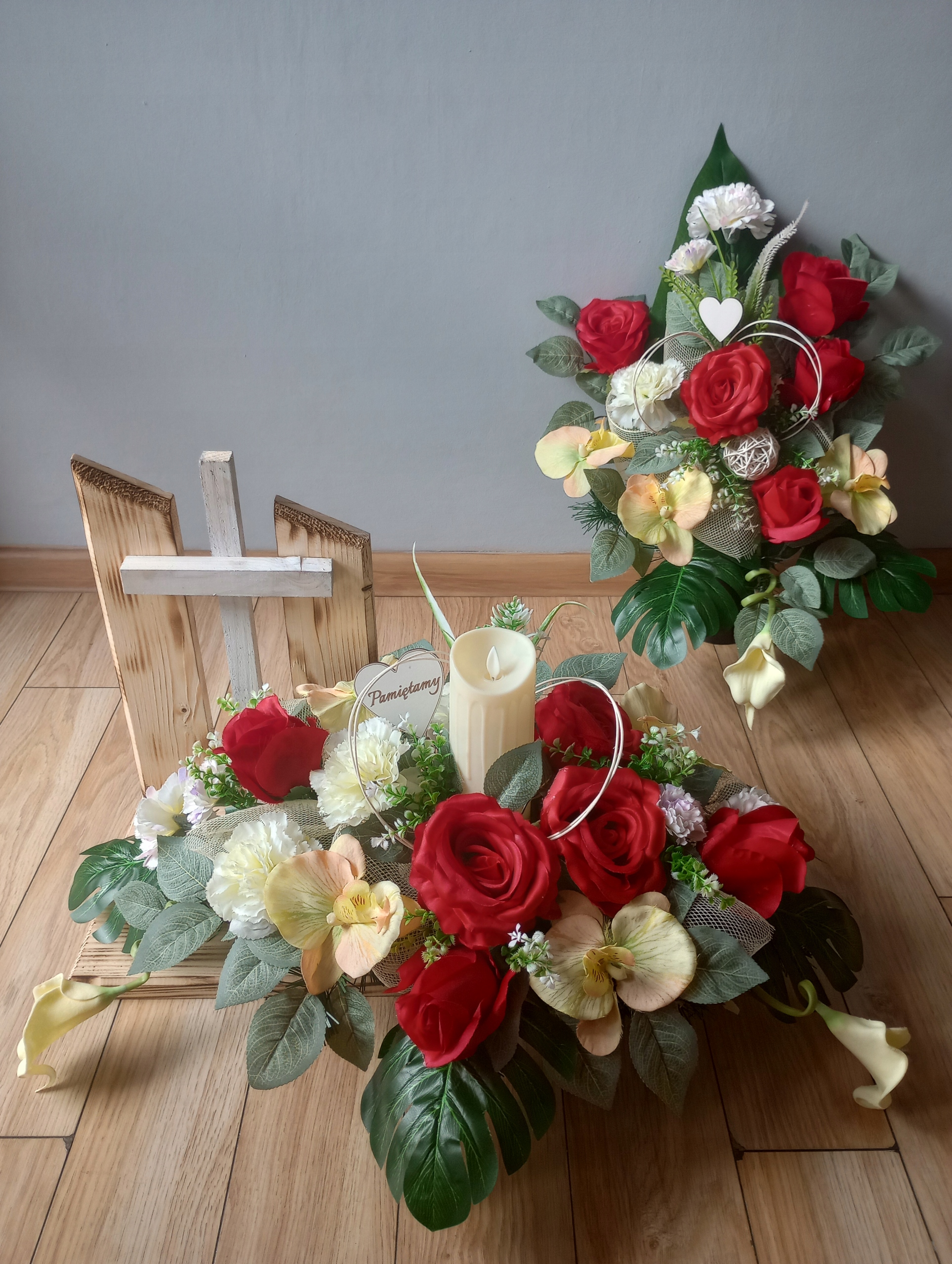 Оформлення на МОГИЛУ зі світлодіодною вставкою, композиція ХРЕСТ, могильні квіти