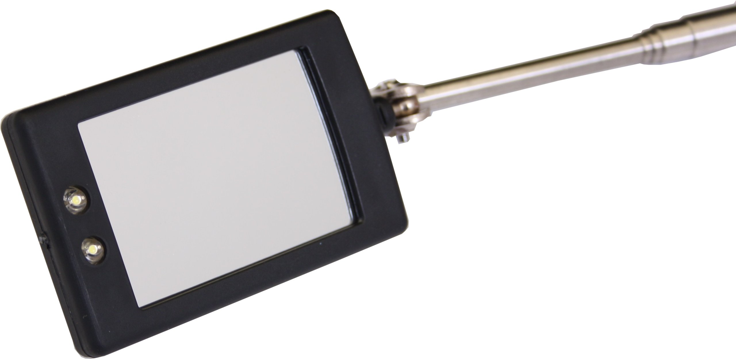 Зеркало смотровое прямоугольное, размеры 80 х 50 мм. Регулировка длины телескопа в диапазоне 280-670 мм. Имеет светодиодную лампу. Зеркало установлено на телескопической штанге из стального листа толщиной 0,6 мм. Продукт полезен на каждом механическом и автомобильном заводе, позволяет просматривать недоступные, скрытые элементы конструкции автомобилей, станков, мебели и т.д.