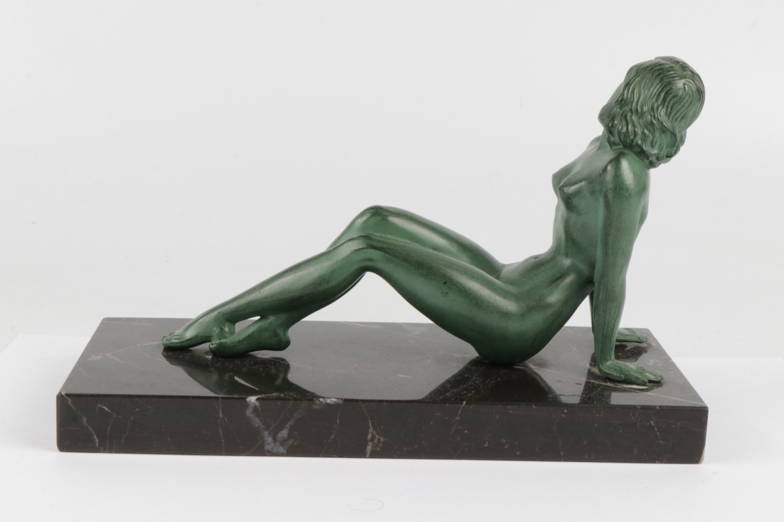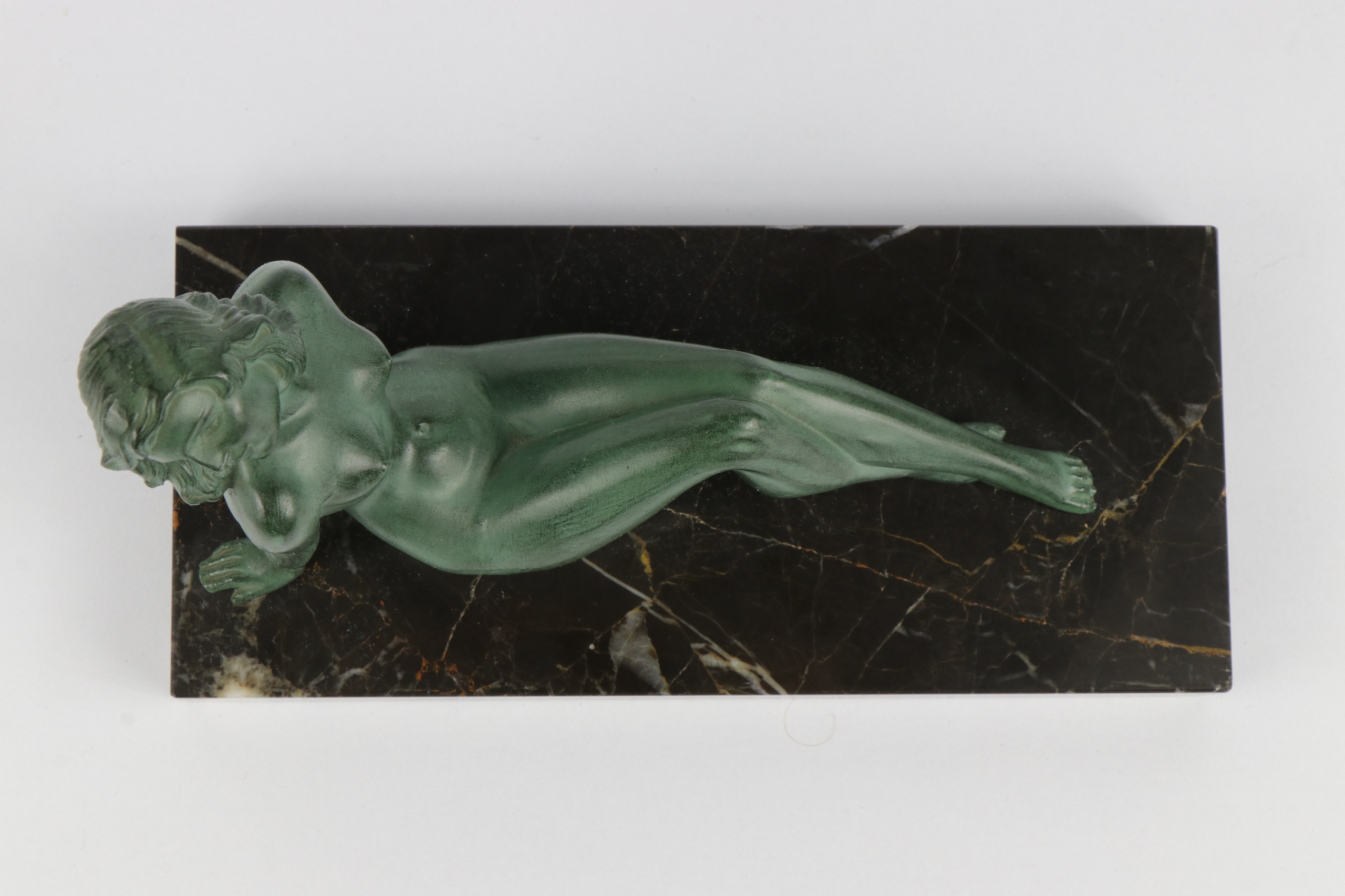 Интересная обнаженная молодая женщина из коричневой патинированной жести на черном мраморе. Статуэтка в стиле ар-деко.