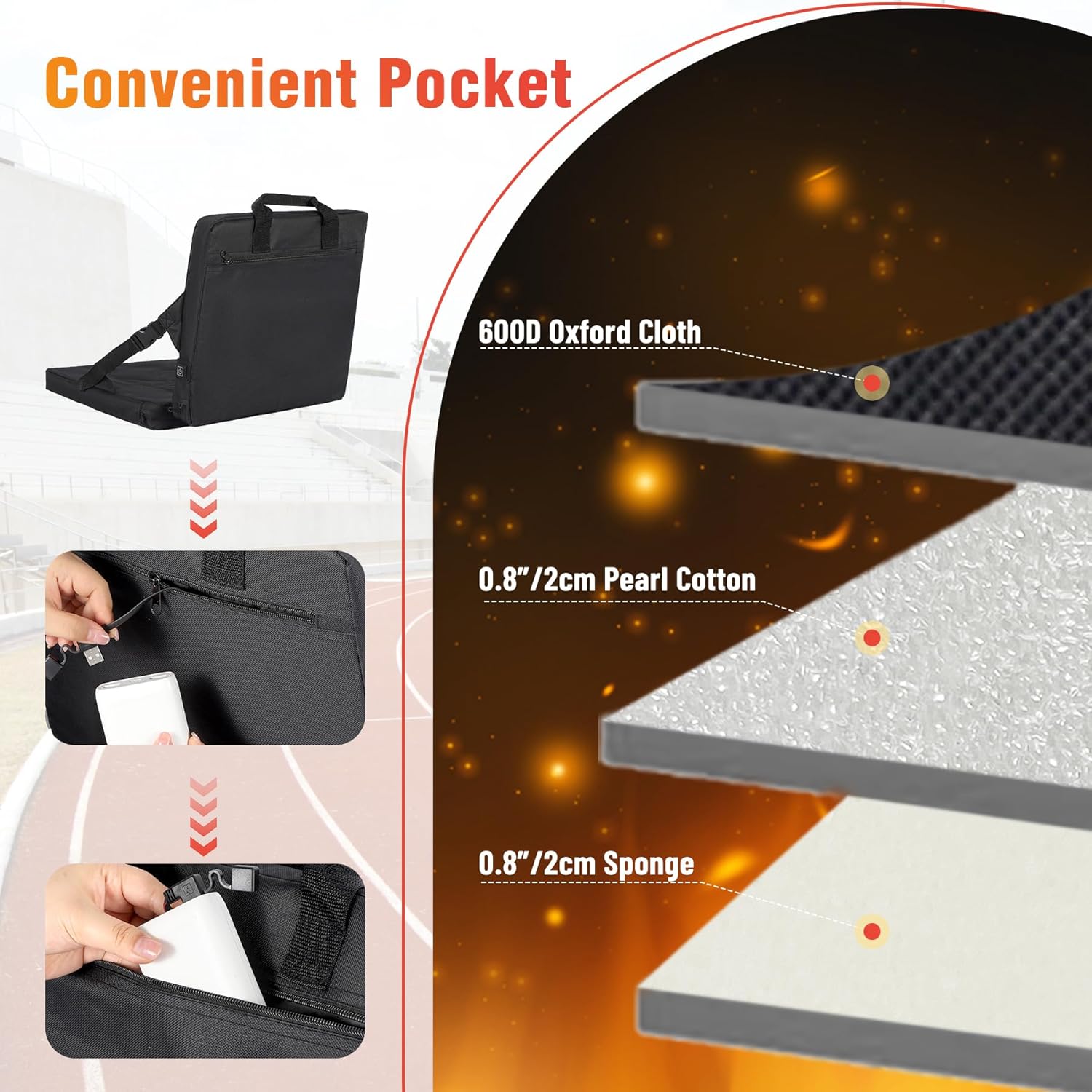 - Удобная постоянная посадка: эти портативные сиденья стадиона изготовлены из Oxford 600D ткани и стеганой хлопчатобумажной ткани на поверхности, которая очень долговечна. Интерьер наполнен жемчужным хлопковым хлопком 2 см и губкой 2 см, что делает его очень приятным для ношения. Толстая подготовленная спина защищает от боли в спине и делает ее прибыльной инвестицией для всех, кто проводит много времени на свежем воздухе.