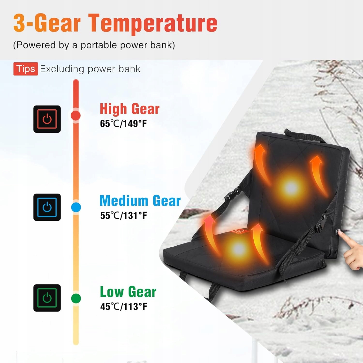 - Регулируемый уровень тепла: наши сиденья на стадионе имеют 3 регулируемых температурных уровня, которые питаются портативным энергетическим банком, которые являются красными (выше 65 ℃), синим (выше 55 ℃) и зеленым (более 55 ℃) 45 ℃). При использовании нажмите и удерживайте в течение примерно трех секунд, чтобы запустить источник питания и отрегулировать температуру для ваших потребностей. В холодном сезоне согревается, пока вы будете наслаждаться игрой. (Советы: рекомендуется отключить питание, когда она не используется).