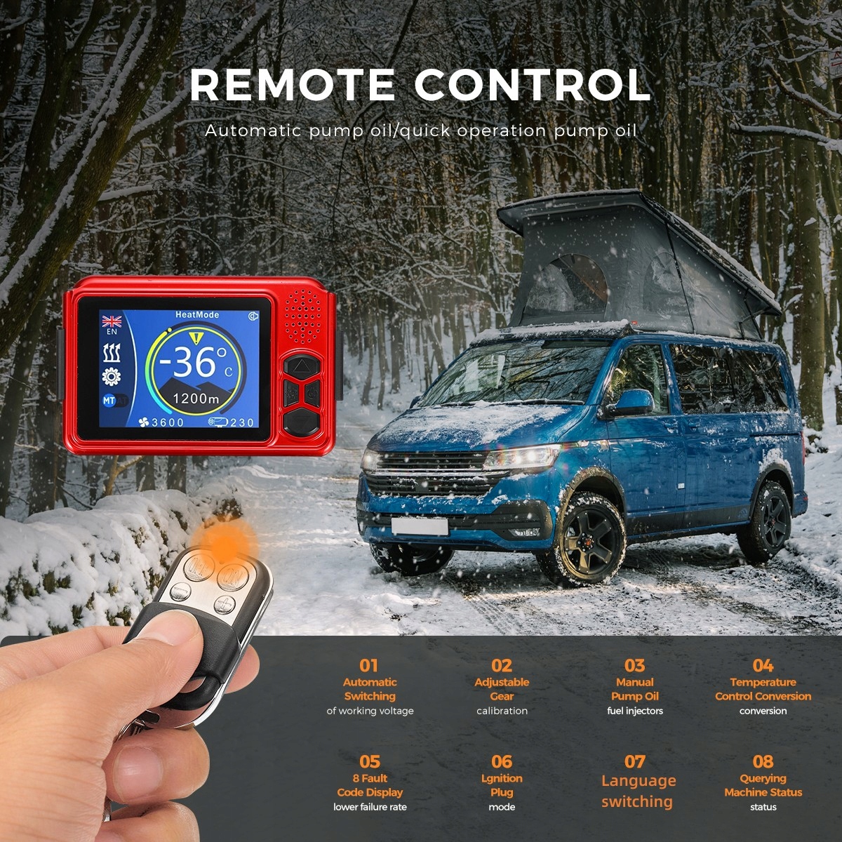 Наш дизельный стояночный обогреватель имеет функцию самотестирования, которая позволяет использовать его независимо в различных условиях. Он также включает защиту от короткого замыкания, интеллектуальный контроль температуры и защиту от перегрева (температура ≥518 °F/270 °C) для обеспечения безопасности и комфорта вас и вашего автомобиля.