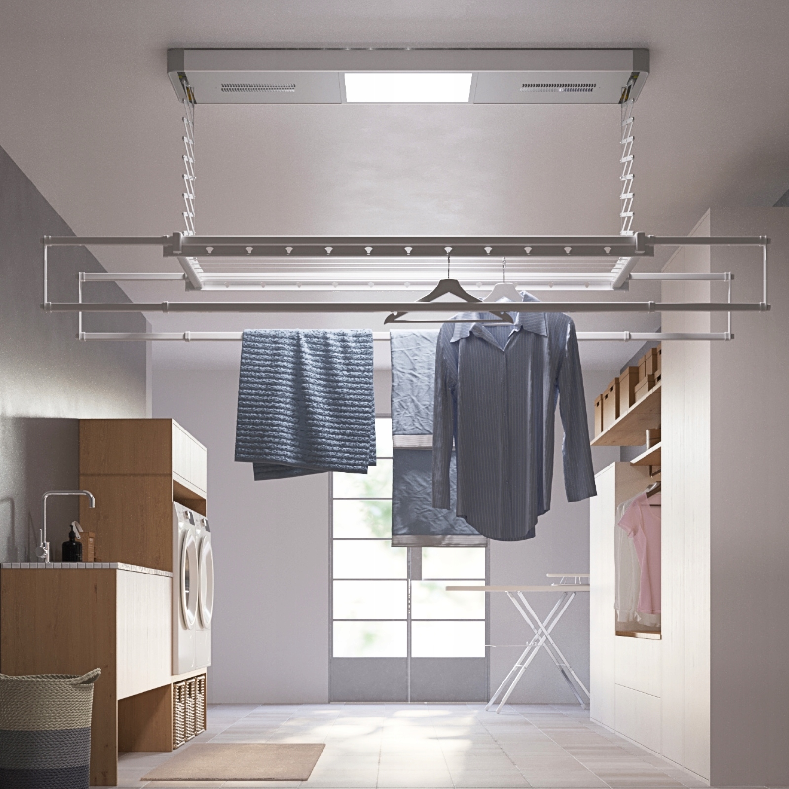 Foxydry Pro — это электрическая сушилка для одежды, которую можно подключить к потолку или стене.