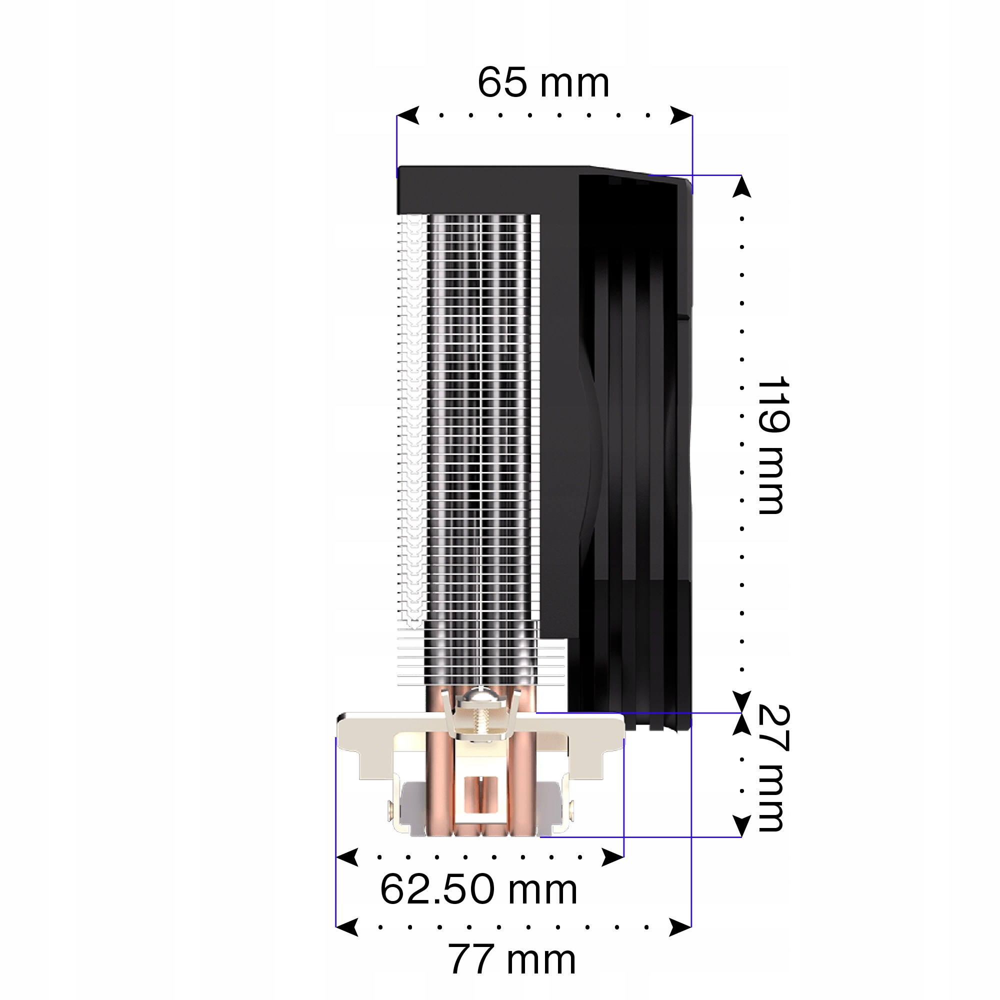 - Высокий уровень охлаждения - радиатор с плотными ребрами и соединенными соединенными к нему с помощью тепловых трубок, он очень хорошо собирает тепловую энергию от подключенного к ним процессора.