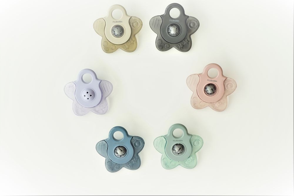 Гризак охлаждающая звезда, необходимая для прорезывания зубов и болит десны. Порекомендовал в двухпакете, благодаря которого можно использовать один, а другой -в холодильнике. Порективы также могут выступать в качестве храпового, благодаря колоколу, помещенного внутри. Мы рекомендуем хранить в холодильнике.