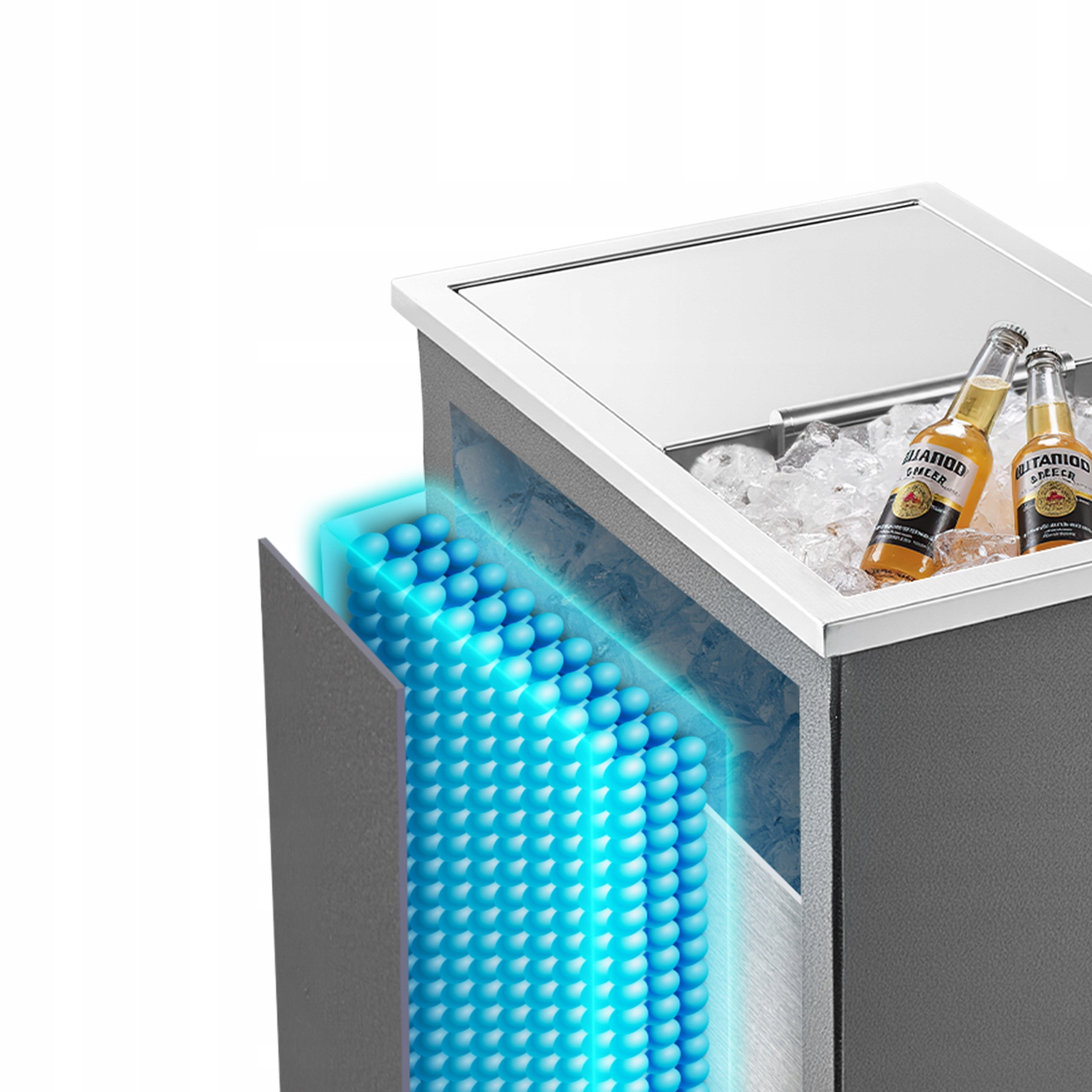 Универсальное использование: контейнер для хранения льда можно установить в магазинах напитков, отелях или барных стойках. Также подходит для кухонных столешниц внутри и снаружи. Встраиваемая установка экономит значительное пространство, и ее можно использовать на открытом воздухе без необходимости использования холодильника.