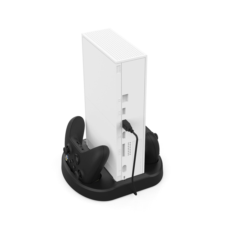 Подставка позволяет поставить консоль Xbox Series S вертикально. Это экономит место. Подставка изготовлена из прочного пластика, поэтому ее можно использовать годами. Подставка оснащена двумя вентиляторами для охлаждения консоли. На станции есть 2 площадки для их зарядки. Кроме того, он оснащен 3 портами USB для зарядки и передачи данных.