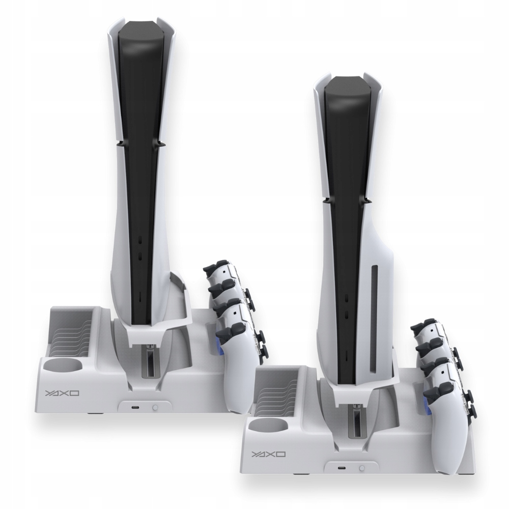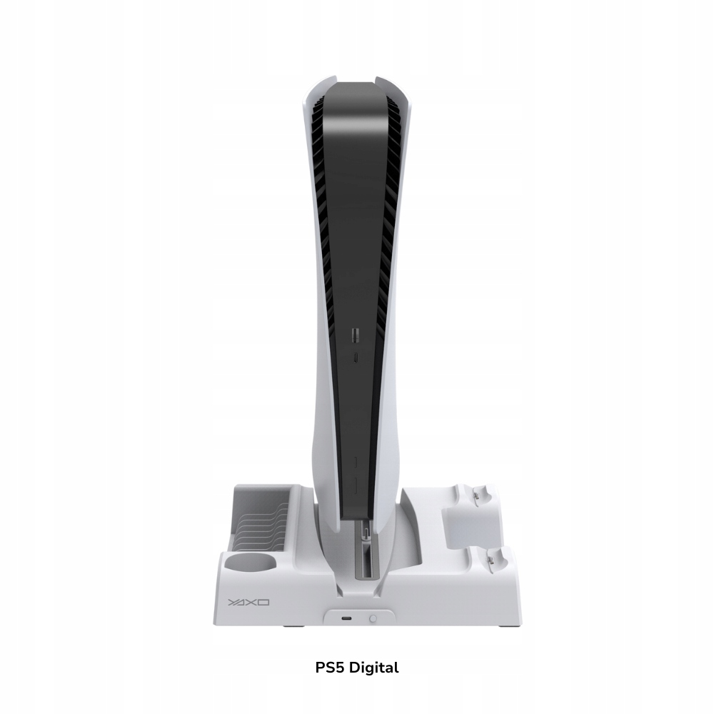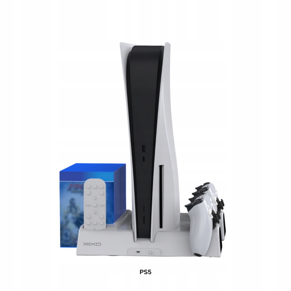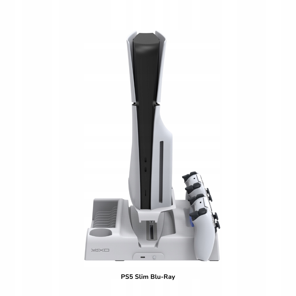 Подставка для охлаждения и зарядки от YAXO совместима с 4 моделями консолей: PS5 5 Blu-Ray/Digital, PS5 Slim Blu-Ray/Digital. Это возможно благодаря специально разработанной базе и дополнительному адаптеру. Консоли PS5 Digital и PS5 Blu-Ray размещаются прямо на подставке (без адаптера). Адаптер позволяет адаптировать подставку к новейшим консолям PlayStation Slim. Консоль размещается вертикально на подставке. Это совершенно безопасно, поскольку устройство защищено от опрокидывания специальным винтом (входит в комплект).