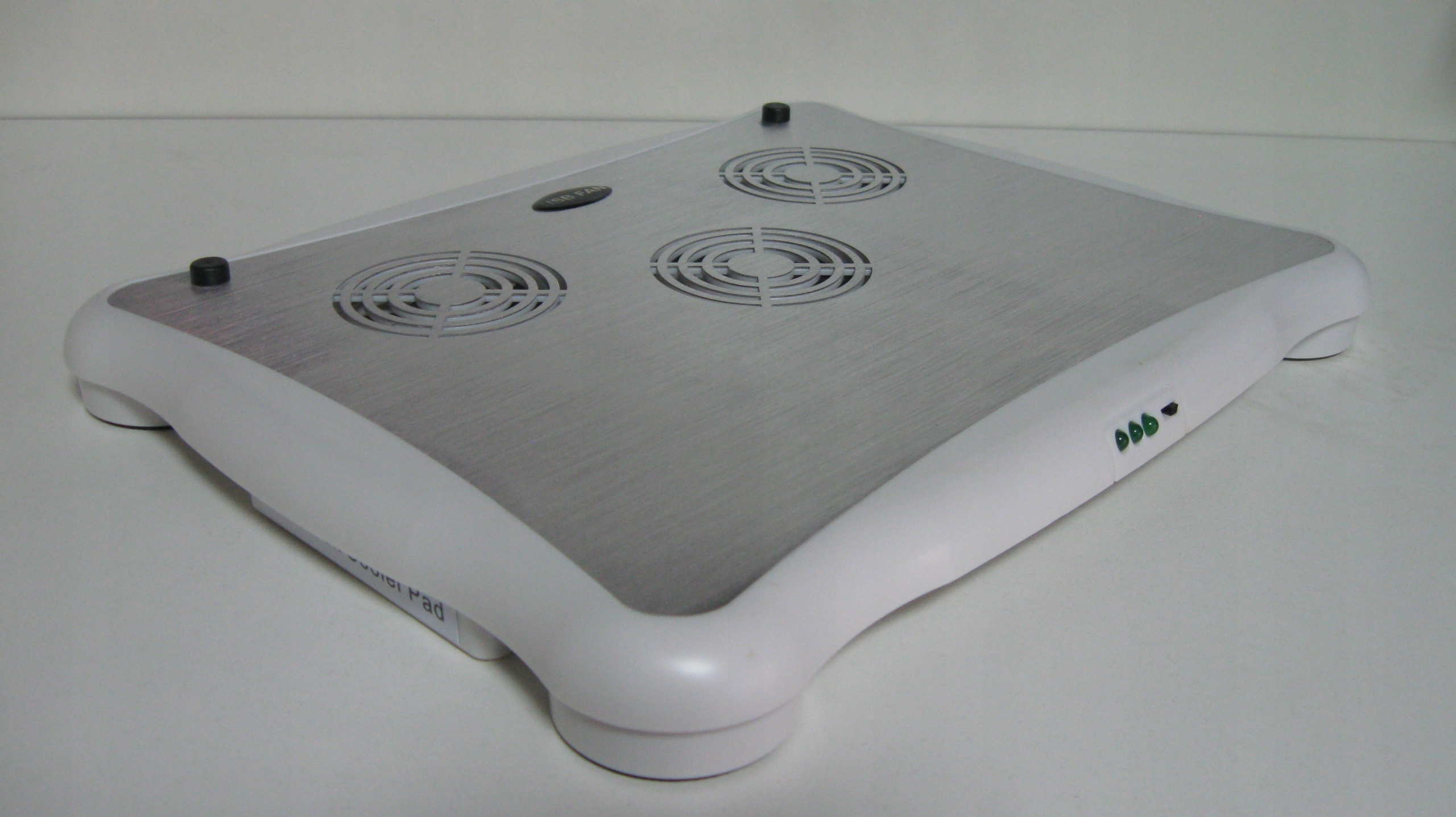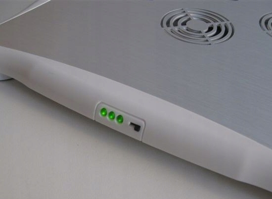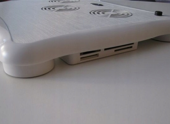 Пэд имеет 3 диода, сигнализирующих о работе 3-х вентиляторов, и удобный переключатель вентиляторов, благодаря которому вы сами решаете, когда они должны сработать. Кроме того, он имеет концентратор с тремя портами USB и одним мини-портом, а также устройство для чтения карт памяти.