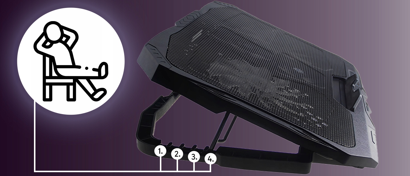 Охлаждающая подставка позволяет регулировать угол наклона при четыре градуса, , что позволяет настроить положение ноутбука в соответствии с вашими потребностями.