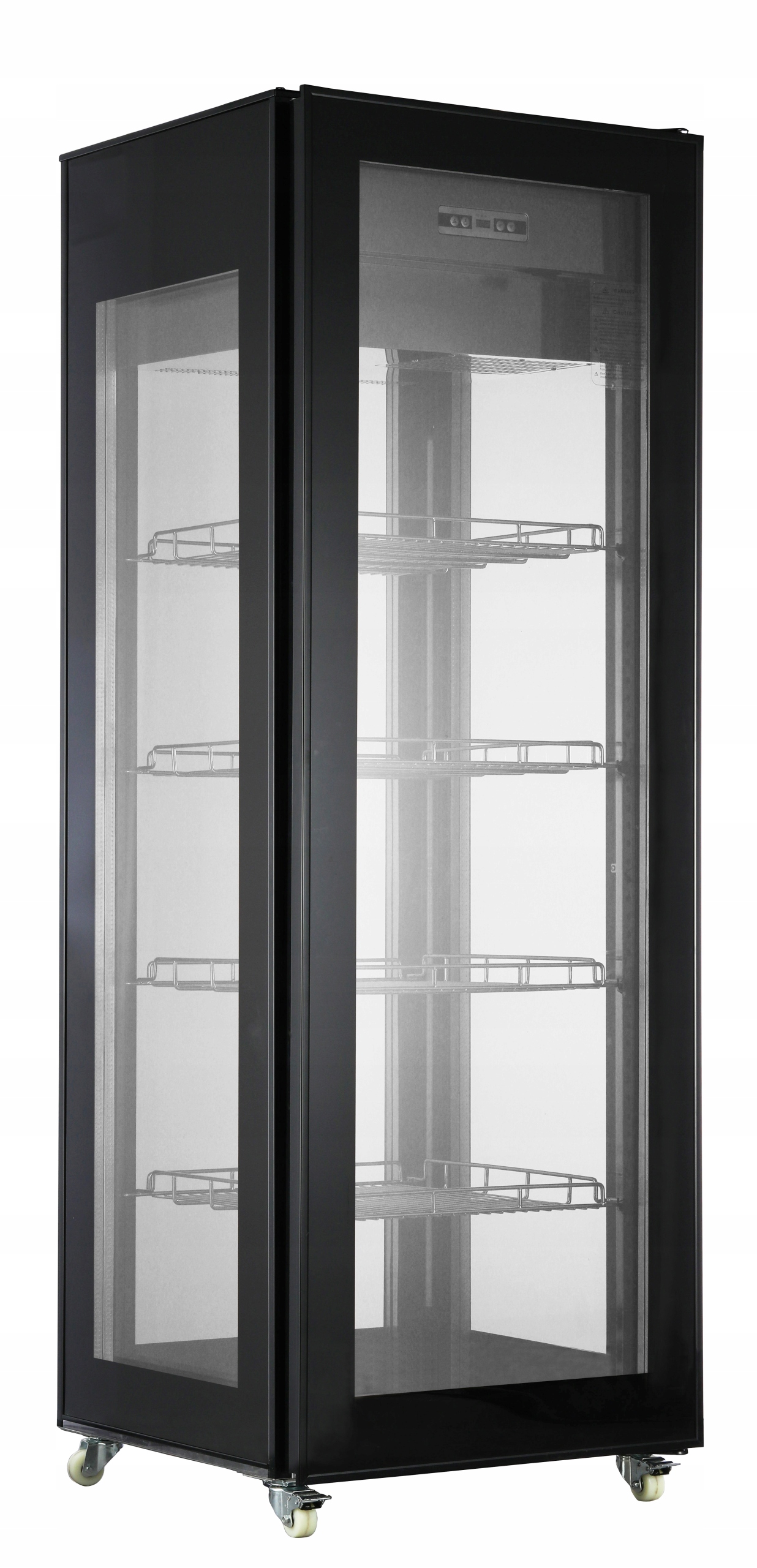 Профессиональная стеклянная четырехсторонняя холодильная витрина. Изготовлен из черной лакированной стали.