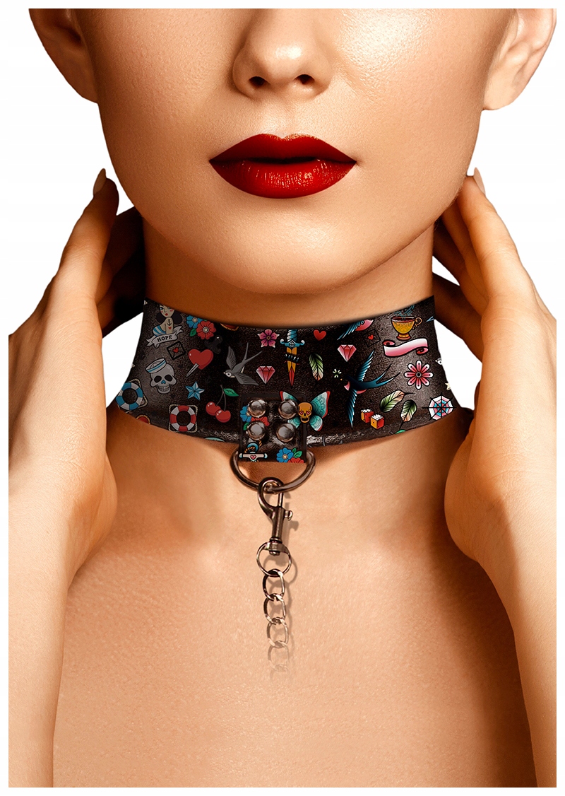 вы покупаете ➪ печатный воротник с поводком - Стиль татуировки старой школы - черный