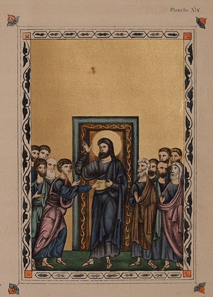 Красивая литография с изображением сцен из Библии по средневековым миниатюрам «Les Arts au Moyen Age» («Искусство в средние века») . h2>Литография расписана вручную.